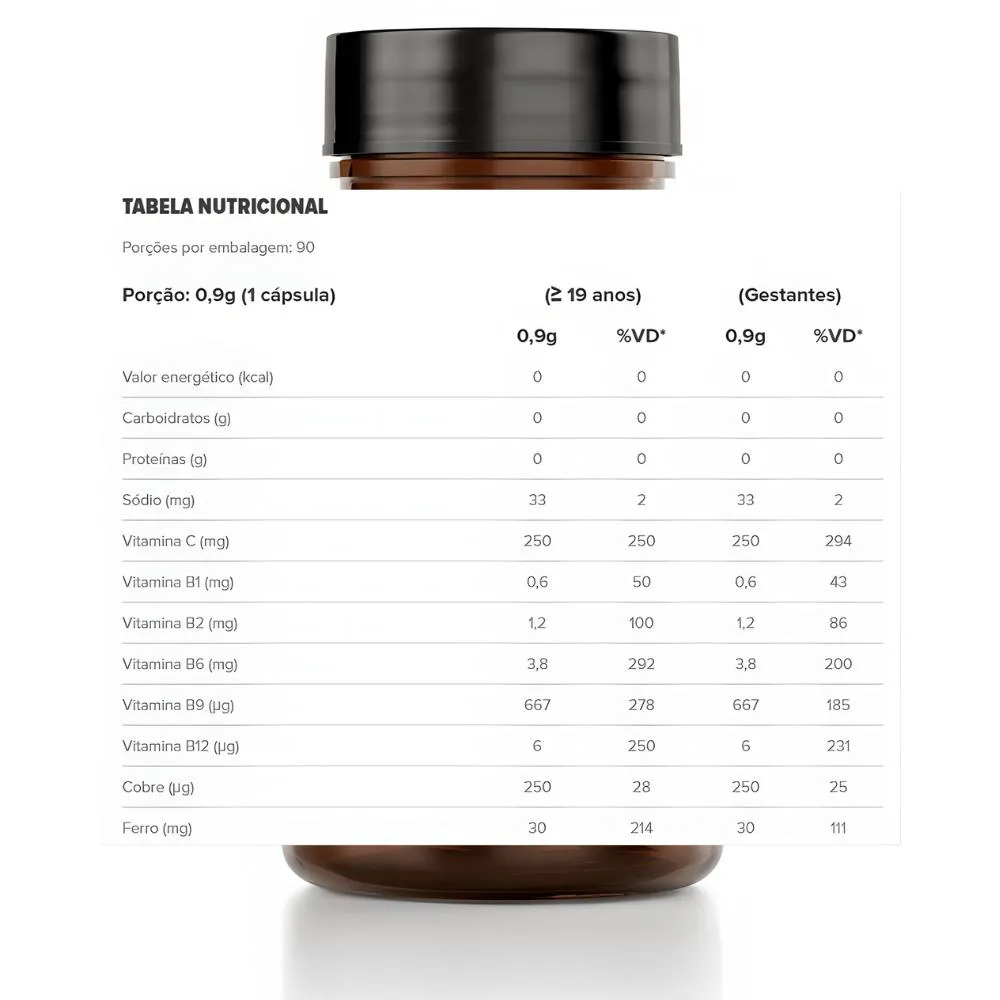 Suplemento de ferro em cápsulas desenvolvido com ferro quelado, vitamina c, cobre quelado e vitaminas do complexo B para uma ação mais completa e eficiente. [Fe] COMPLEX é um suplemento formulado com ferro quelado, cobre quelado, vitamina C e vitaminas do complexo B. Esses nutrientes foram escolhidos para trabalhar em sinergia, proporcionando melhor absorção e aproveitamento do ferro pelo organismo. Complexo na fórmula, essencial no cuidado A biodisponibilidade do ferro e sua ação efetiva no organismo dependem de vários nutrientes, que ajudam na sua absorção e no seu transporte e metabolismo. Por isso, [Fe] Complex combina elementos-chave que trabalham em sinergia. VITAMINA C A vitamina C auxilia na absorção do ferro dos alimentos. Também atua como antioxidante e auxilia no funcionamento do sistema imune e no metabolismo energético. COBRE QUELADO Auxilia no transporte do ferro no organismo, para assegurar que ele chegue onde o corpo precisa. Além disso, contribui para proteção antioxidante, imunidade e metabolismo energético. VITAMINAS DO COMPLEXO B Assim como o ferro, vitaminas do complexo B participam da produção das células vermelhas do sangue. Também atuam no metabolismo energético e no metabolismo de proteínas, carboidratos e gorduras, assim como ajudam no funcionamento do sistema imune. Modo de uso Consuma 1 cápsula ao dia ou consulte seu médico ou nutricionista para individualizar a dose de acordo com seu quadro clínico. *Esse produto não é um medicamento, não tem como objetivo auxiliar no tratamento, cura ou combate de qualquer doença Registro no M.S. nº Produto dispensado de registro RDC 240 de 2018