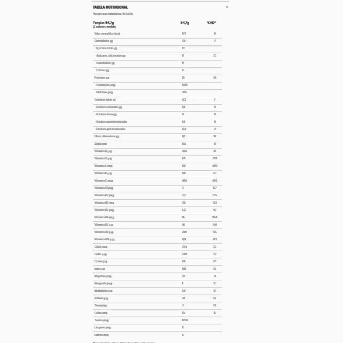 A composição inclui proteínas de alto valor biológico, fibras prebióticas, vitaminas do complexo B, A, C, D, E, minerais quelados e gorduras de fontes como óleo de coco. É isento de glúten, lactose, açúcar e conservantes artificiais.