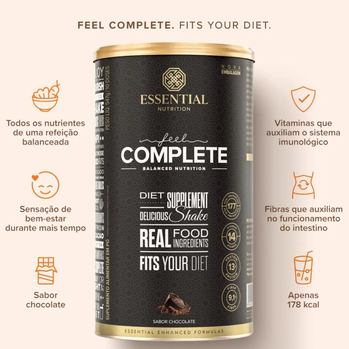 Feel Complete Shake da Essential Nutrition é um shake nutricional completo que combina proteínas vegetais e/ou derivadas do soro, fibras, vitaminas, minerais e gorduras boas em uma embalagem de 547 g. Destina-se a complementar refeições ou servir como opção prática nos dias corridos.
