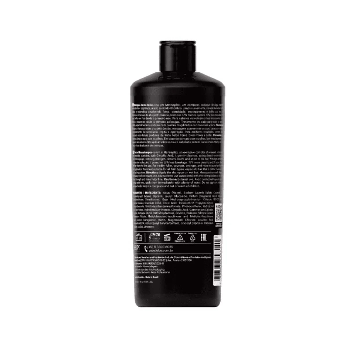 shampoo Force gloss Felps Professional - 500mL Shampoo Force Gloss rico em Marineplex, um complexo exclusivo de algas marinhas, aminoácidos e peptídeos, aliado ao Ácido Glicólico. Limpa suavemente, atua diretamente na fibra capilar e redensifica devolvendo força, densidade, encorpamento e brilho aos fios. Com moléculas bioativas de alta performance promove 57% menos quebra, 18% mais densidade e 2X mais brilho aos fios desde o primeiro uso. Para cabelos visivelmente mais encorpados, jovens, fortes e resistentes desde a primeira aplicação. Tratamento indicado para todos os tipos de cabelo, especialmente os cabelos com quebra, fragilizados ou finos e sem volume. Modo de Uso: Aplique o shampoo sobre o cabelo úmido, massageie suavemente o coura cabeludo e enxágue completamente. Se necessário, repita a operacao. Composição: Aqua (Water), Sodium Laureth Sulfate, Cocamide DEA, Cocamidopropyl Betaine, Glycerin, Lauryl Glucoside, Parfum (Fragrance), Glycol Distearate, Amodimethicone, Dimethiconol, Guar Hydroxypropyltrimonium Chloride, PEG-120 Methyl Glucose Dioleate, Disodium EDTA, Citric Acid, Trideceth-12, Propylene Glycol, Sodium Benzoate, TEA-Dodecylbenzenesulfonate, Phenoxyethanol, Hydrolyzed Rice Bran Protein, Hydrolyzed Soy Protein, Glycolic Acid, Cetrimonium Chloride, Arginine, Pentylene Glycol, DMDM Hydantoin, Glycine, Palmaria Palmata Extract, Magnesium Nitrate, Methylchloroisothiazolinone and Methylisothiazolinone, Algin, Sodium Carrageenan, Biotin, Magnesium Chloride, Levulinic Acid, Tetrasodium EDTA, Iodopropynyl Butylcarbanate, Glyceryl Caprylate, Potassium Sorbate, Linalool, Limonene.
