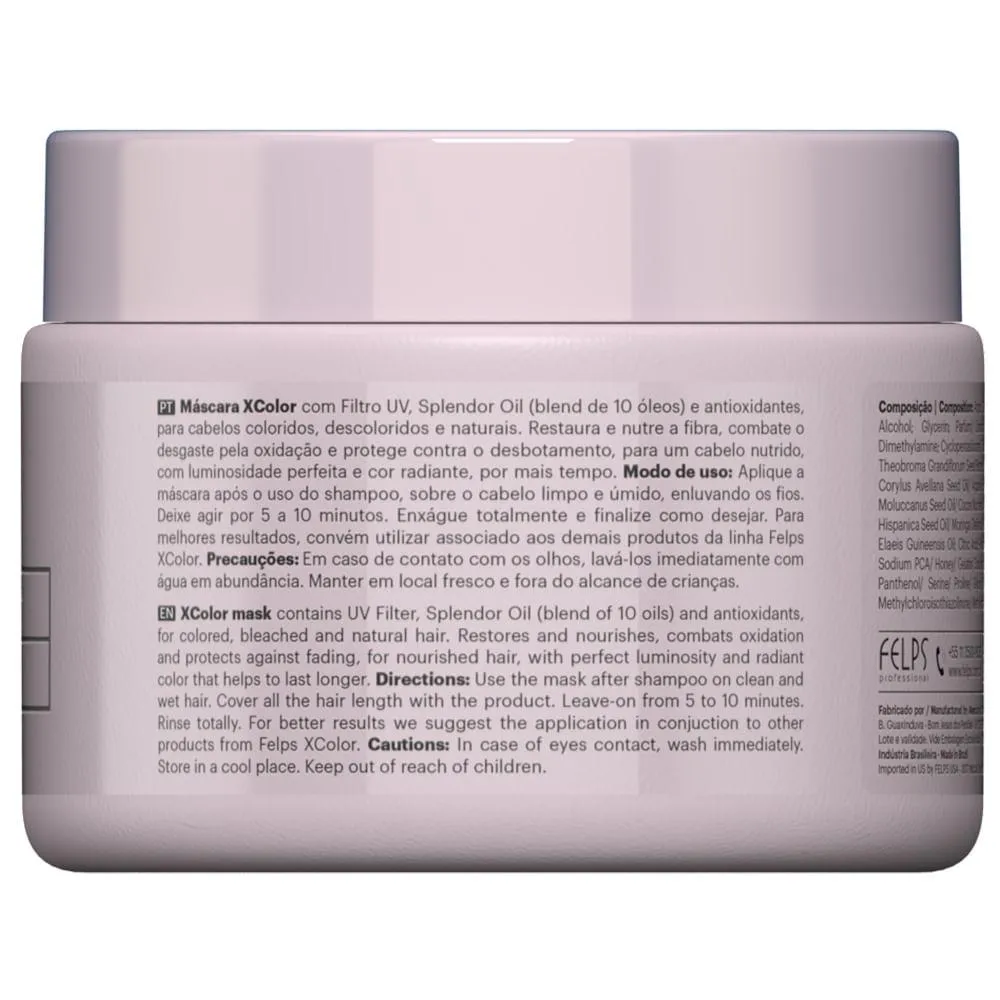 Felps Profissional XColor Máscara ainda previne o desbotamento da cor causados pelos raios UV e agressores externos. Sua fórmula proporciona toque macio, força e brilho intenso para restaurar a aparência saudável dos fios depois da química e dos danos diários.