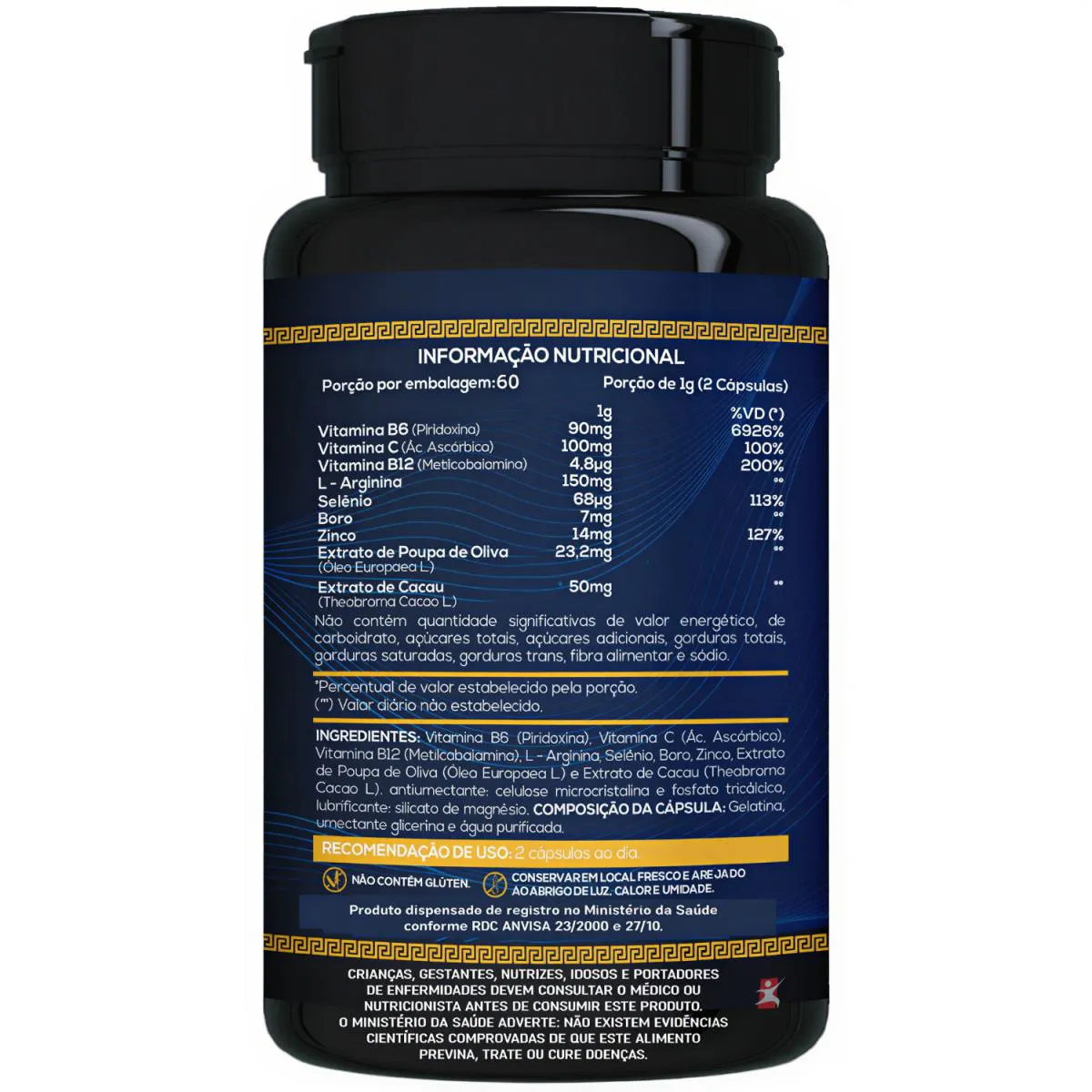 Extrato de Semente de Feno Grego (Trigonella Foenum- Graecum L), Vitamina B6 (Piridoxina), vitamina c (Ác. Ascórbico), Vitamina B12 (Metilcobalamina), L - Arginina, Selênio, Boro, Zinco, Extrato de Poupa de Oliva (Óleo Europaea L.) e Extrato de Cacau (Theobroma Cacao L.). antiumectante: celulose microcristalina e fosfato tricálcico, lubrificante: silicato de magnésio.