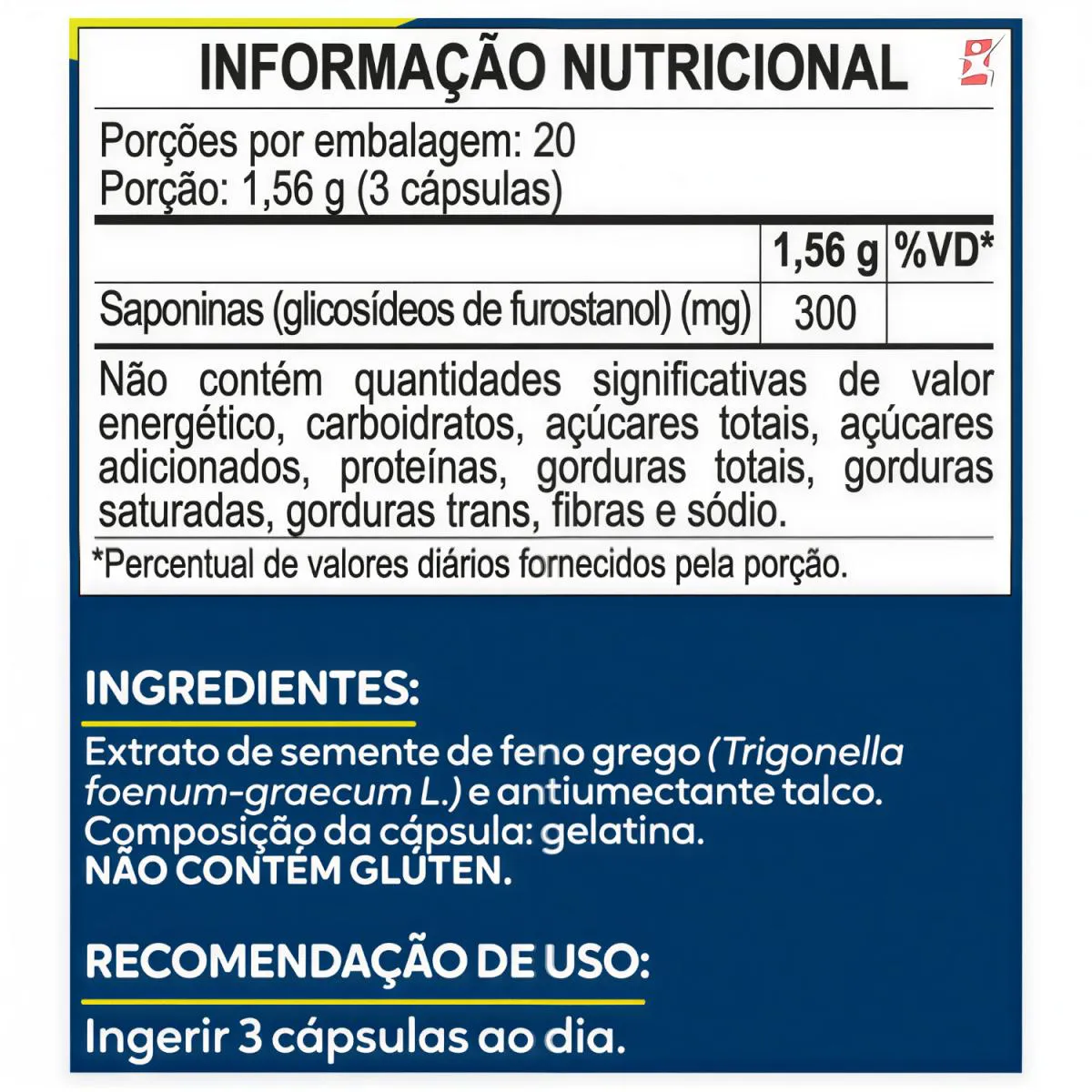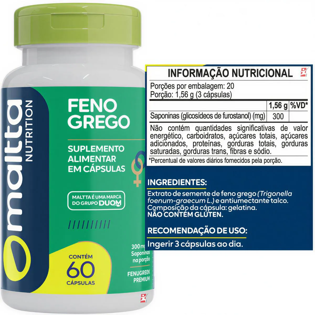 FENO GREGO FENUGREEK PREMIUM 300MG DE SAPONINAS NA PORÇÃO - MALTTA NUTRITION DESCRIÇÃO O Feno-grego é uma planta originária da região do Mediterrâneo e da Ásia. O suplemento de feno-grego é extraído das sementes da Trigonella foenum-graecum. A porção contém 300mg de saponinas. BENEFÍCIOS - Rende 20 doses/porções; - Apenas 03 cápsulas ao dia; - Suporte à saúde geral e bem-estar natural (pela presença de compostos bioativos); - Ajuda na sensação de saciedade e controle do apetite, podendo contribuir para hábitos alimentares mais equilibrados; - Apoio ao metabolismo saudável, incluindo possíveis efeitos no metabolismo de gorduras e açúcares no sangue; - Suporte à disposição e energia, frequentemente mencionado em usos tradicionais. RECOMENDAÇÃO DE USO Ingerir 3 cápsulas ao dia. INGREDIENTES Extrato de semente de feno grego (Trigonella foenum-graecum L.) e antiumectante talco. Composição da cápsula: gelatina. NÃO CONTÉM GLÚTEN. SINERGIA DE VITAMINAS E minerais Pode ser combinado com o boro e arginina. DADOS TECNICOS FENO GREGO. SUPLEMENTO ALIMENTAR EM CÁPSULAS. 300mg de saponinas na porção. FENUGREEK PREMIUM. Contém 60 cápsulas. PRODUTO DESTINADO A PESOAS ACIMA DE 19 ANOS. ESTE PRODUTO NÃO É UM MEDICAMENTO. NÃO EXCEDER A RECOMENDAÇÃO DIÁRIA DE CONSUMO INDICADA NA EMBALAGEM. MANTENHA FORA DO ALCANCE DE CRIANÇAS. ESTE PRODUTO NÃO DEVE SER CONSUMIDO POR GESTANTES, LACTANTES E CRIANÇAS.