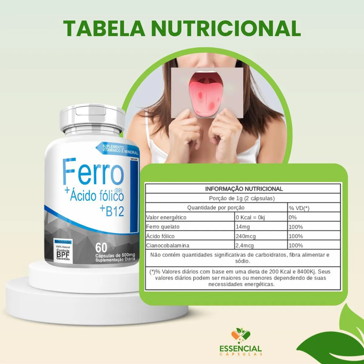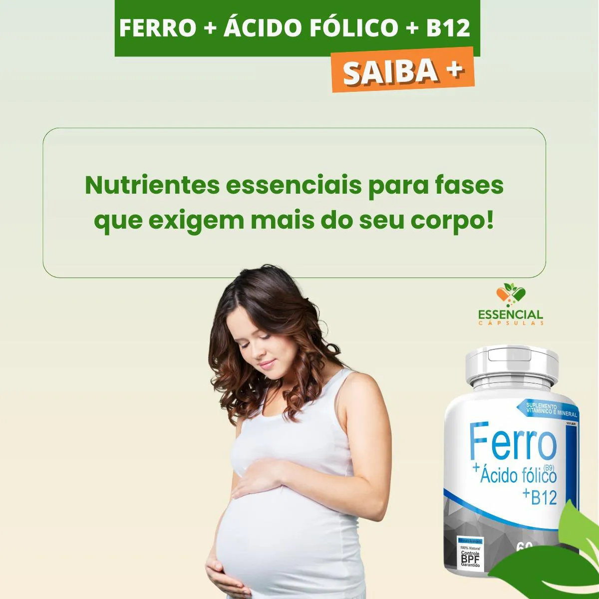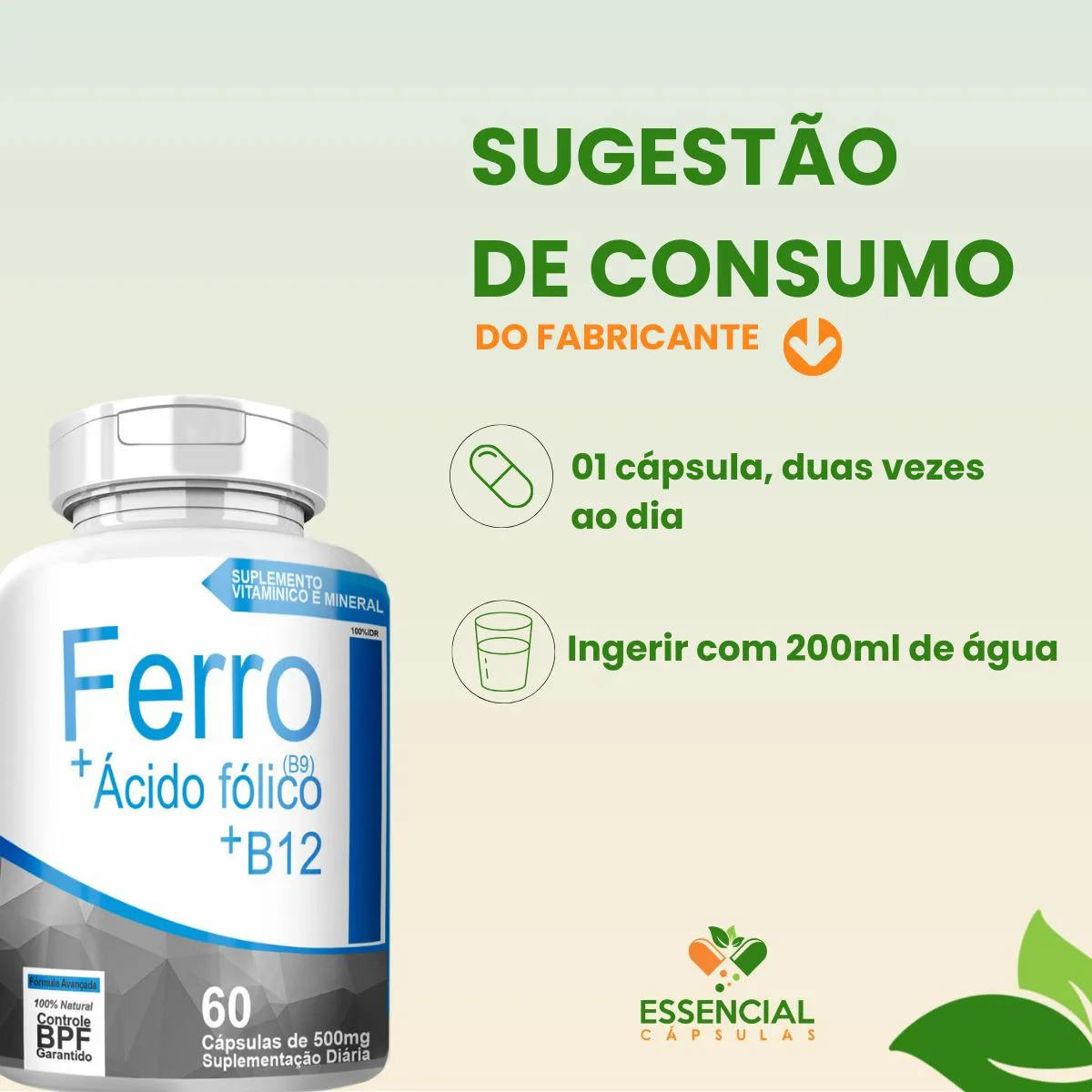 BEM VINDO(A) À ESSENCIAL CÁPSULAS Aqui, acreditamos que cuidar da saúde pode (e deve) ser algo natural, leve e diário. PRODUTO: - Ferro + Ácido Fólico (B9) + B12 MARCA: - 4Elementos BENEFÍCIOS: ● Combinação de ferro com vitaminas do complexo B ● Para as fases de maior demanda do corpo SUGESTÃO DE CONSUMO (PELO FABRICANTE): - 1 cápsula duas vezes ao dia - Ingerir com 200ml de água IMPORTANTE SABER: - Este produto é um suplemento alimentar natural. - Não é medicamento e não substitui uma alimentação equilibrada nem o acompanhamento de um profissional da saúde. - Como um produto natural, seus benefícios podem ser vistos a partir de alguns dias do uso. - Os suplementos são destinados a pessoas saudáveis. Sua finalidade é fornecer nutrientes, substâncias bioativas, enzimas ou probióticos em complemento à alimentação. COMPOSIÇÃO: - FERRO QUELATO, B9 (ÁCIDO FÓLICO) E B12 (CIANOCOBALAMINA). NÃO CONTÉM GLÚTEN CONTRAINDICAÇÃO: - O uso não é recomendado para gestantes, lactantes e crianças. - Em caso de uso contínuo de medicamentos ou condições específicas de saúde, busque a orientação de um profissional da saúde. QUALIDADE: - Sabemos que o mercado de suplementos é competitivo, com opções para todos os públicos e faixas de preço. Na nossa loja, priorizamos a qualidade em cada detalhe. Por isso, escolhemos trabalhar apenas com fábricas que utilizam matérias-primas de excelência e seguem rigorosos padrões de produção. ENVIAMOS RAPIDINHO: - Seu pedido é preparado com todo cuidado e postado em até 24 horas úteis após a confirmação da compra. (Na maioria das vezes, enviamos bem antes disso)! FALE CONOSCO: Tem dúvidas ou quer conversar sobre o produto? Nosso atendimento é humanizado e está sempre pronto para te ouvir com muita atenção!