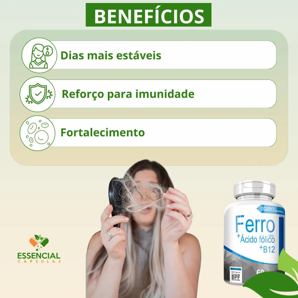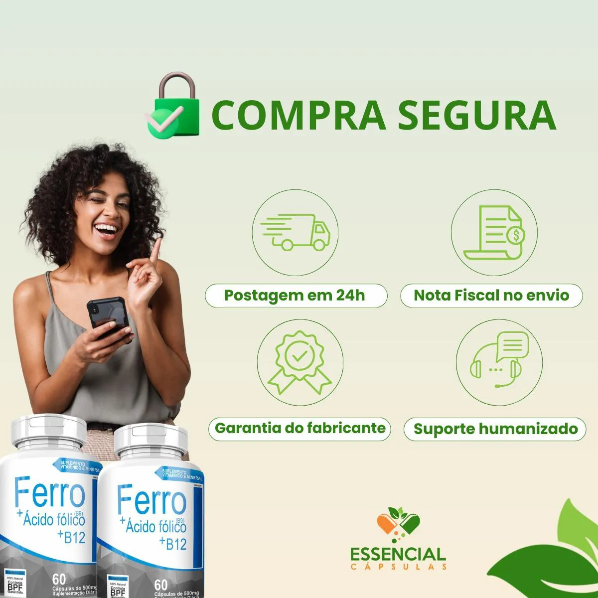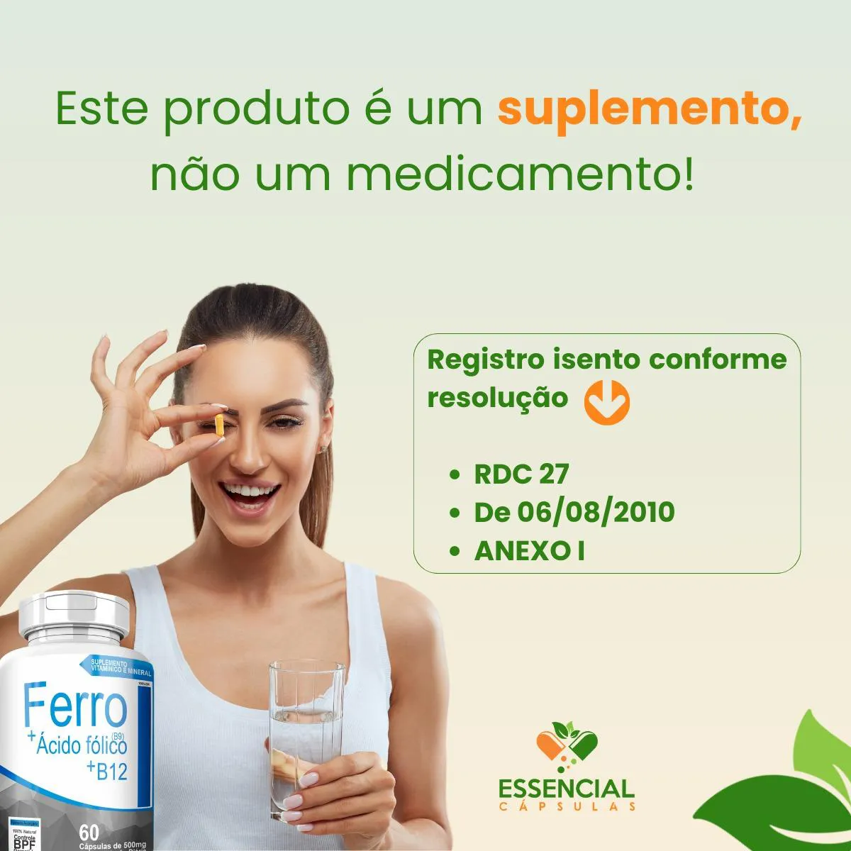 BEM VINDO(A) À ESSENCIAL CÁPSULAS Aqui, acreditamos que cuidar da saúde pode (e deve) ser algo natural, leve e diário. PRODUTO: - Ferro + Ácido Fólico (B9) + B12 MARCA: - 4Elementos BENEFÍCIOS: ● Combinação de ferro com vitaminas do complexo B ● Para as fases de maior demanda do corpo SUGESTÃO DE CONSUMO (PELO FABRICANTE): - 1 cápsula duas vezes ao dia - Ingerir com 200ml de água IMPORTANTE SABER: - Este produto é um suplemento alimentar natural. - Não é medicamento e não substitui uma alimentação equilibrada nem o acompanhamento de um profissional da saúde. - Como um produto natural, seus benefícios podem ser vistos a partir de alguns dias do uso. - Os suplementos são destinados a pessoas saudáveis. Sua finalidade é fornecer nutrientes, substâncias bioativas, enzimas ou probióticos em complemento à alimentação. COMPOSIÇÃO: - FERRO QUELATO, B9 (ÁCIDO FÓLICO) E B12 (CIANOCOBALAMINA). NÃO CONTÉM GLÚTEN CONTRAINDICAÇÃO: - O uso não é recomendado para gestantes, lactantes e crianças. - Em caso de uso contínuo de medicamentos ou condições específicas de saúde, busque a orientação de um profissional da saúde. QUALIDADE: - Sabemos que o mercado de suplementos é competitivo, com opções para todos os públicos e faixas de preço. Na nossa loja, priorizamos a qualidade em cada detalhe. Por isso, escolhemos trabalhar apenas com fábricas que utilizam matérias-primas de excelência e seguem rigorosos padrões de produção. ENVIAMOS RAPIDINHO: - Seu pedido é preparado com todo cuidado e postado em até 24 horas úteis após a confirmação da compra. (Na maioria das vezes, enviamos bem antes disso)! FALE CONOSCO: Tem dúvidas ou quer conversar sobre o produto? Nosso atendimento é humanizado e está sempre pronto para te ouvir com muita atenção!