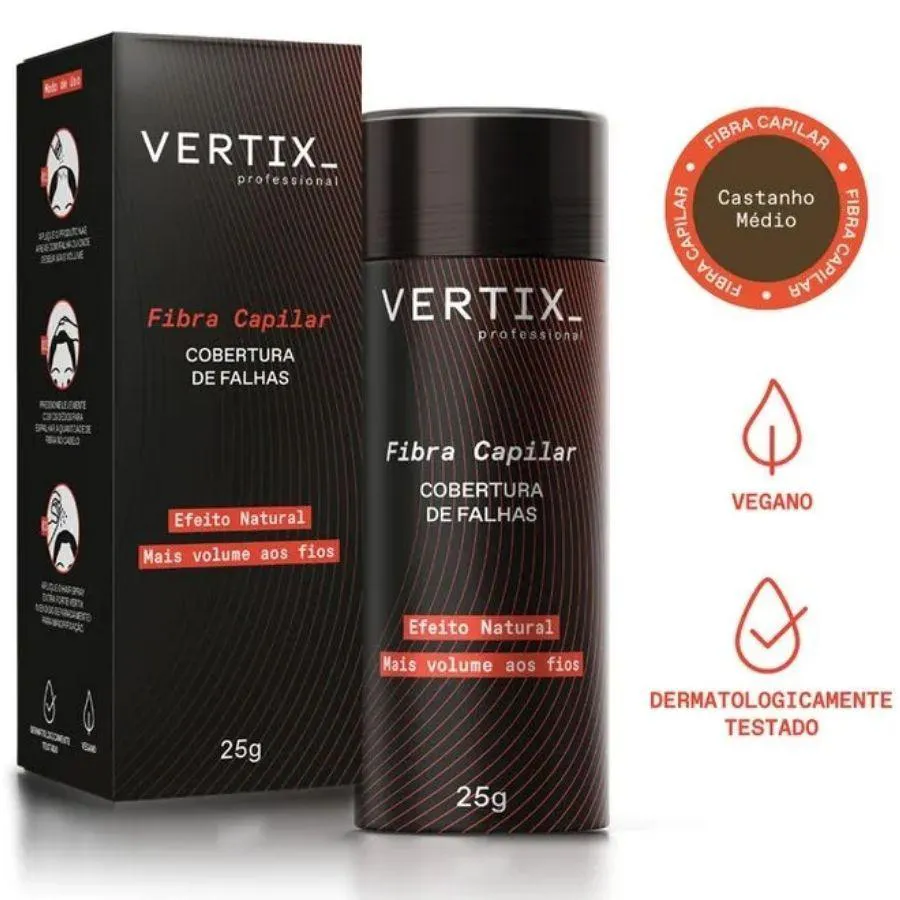 Fibra Capilar Vertix 25g A solução instantânea para preencher falhas! Fibra Capilar Vertix é a solução para disfarçar falhas no couro cabeludo e aumentar o volume dos fios. Ideal para quem deseja um efeito natural e instantâneo, com um acabamento impecável. BENEFÍCIOS DA FIBRA CAPILAR VERTIX: • Cobertura completa e natural de falhas no cabelo e na barba • Volume instantâneo e aparência de fios mais densos • Criação de penteados mais estruturados e volumosos. • Compatível com todos os tipos de cabelo, para homens e mulheres Dicas de Cuidado: • Mantenha o frasco bem fechado quando não estiver em uso. • Evite o contato com água e produtos que possam interferir na aderência da fibra. • Armazene em local seco e fresco. Modo de Uso • Aplique o produto nas áreas com falha ou onde deseja mais volume • Pressione levemente com os dedos para espalhar a quantidade de fibra no cabelo