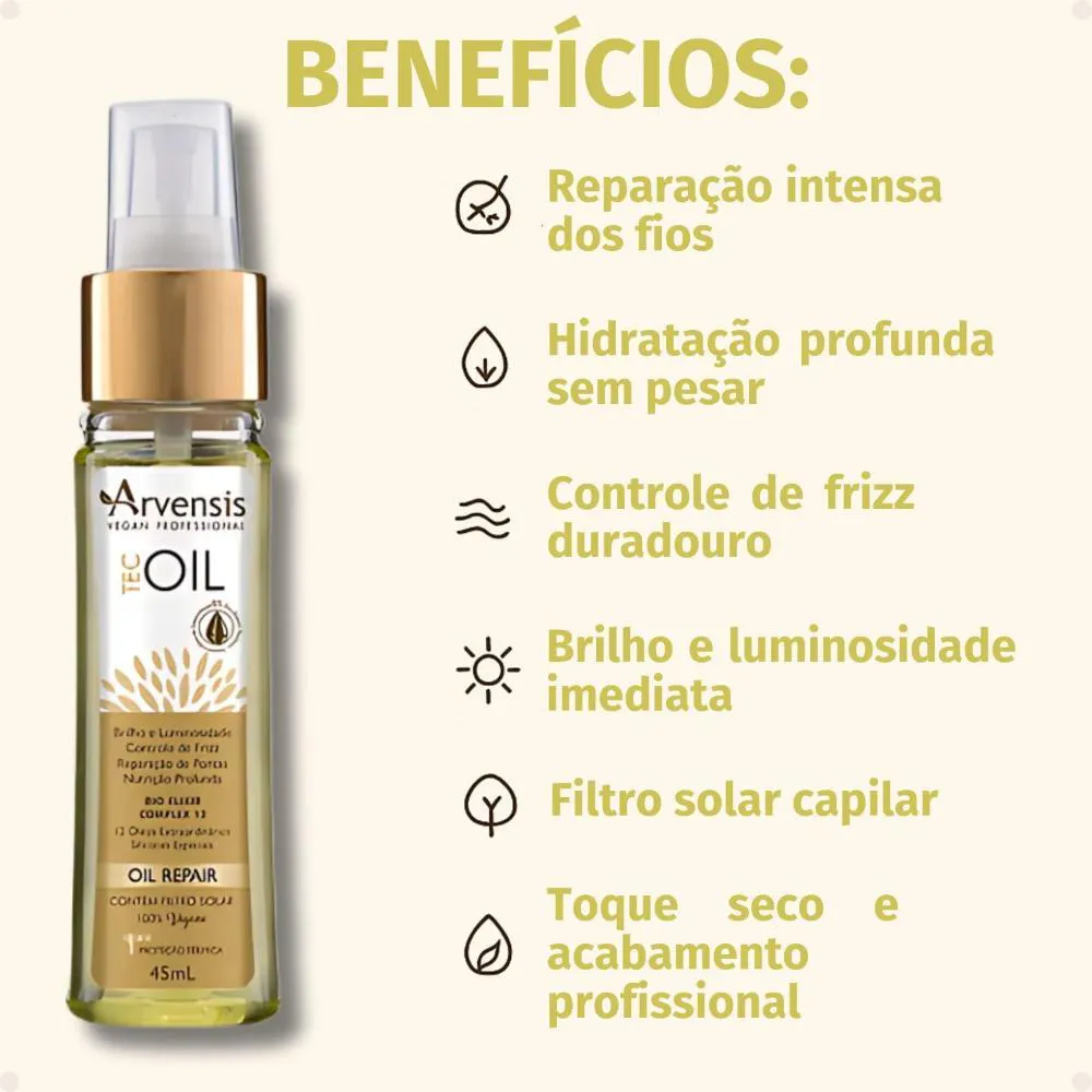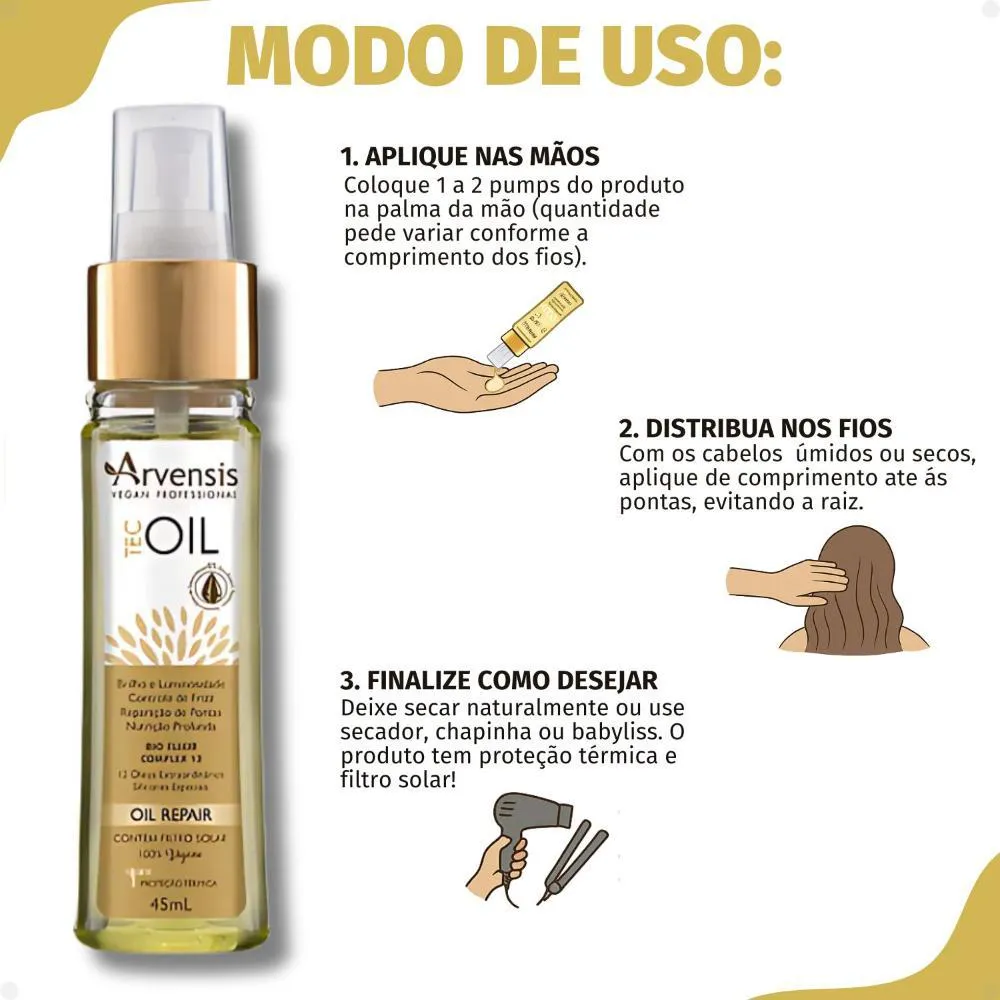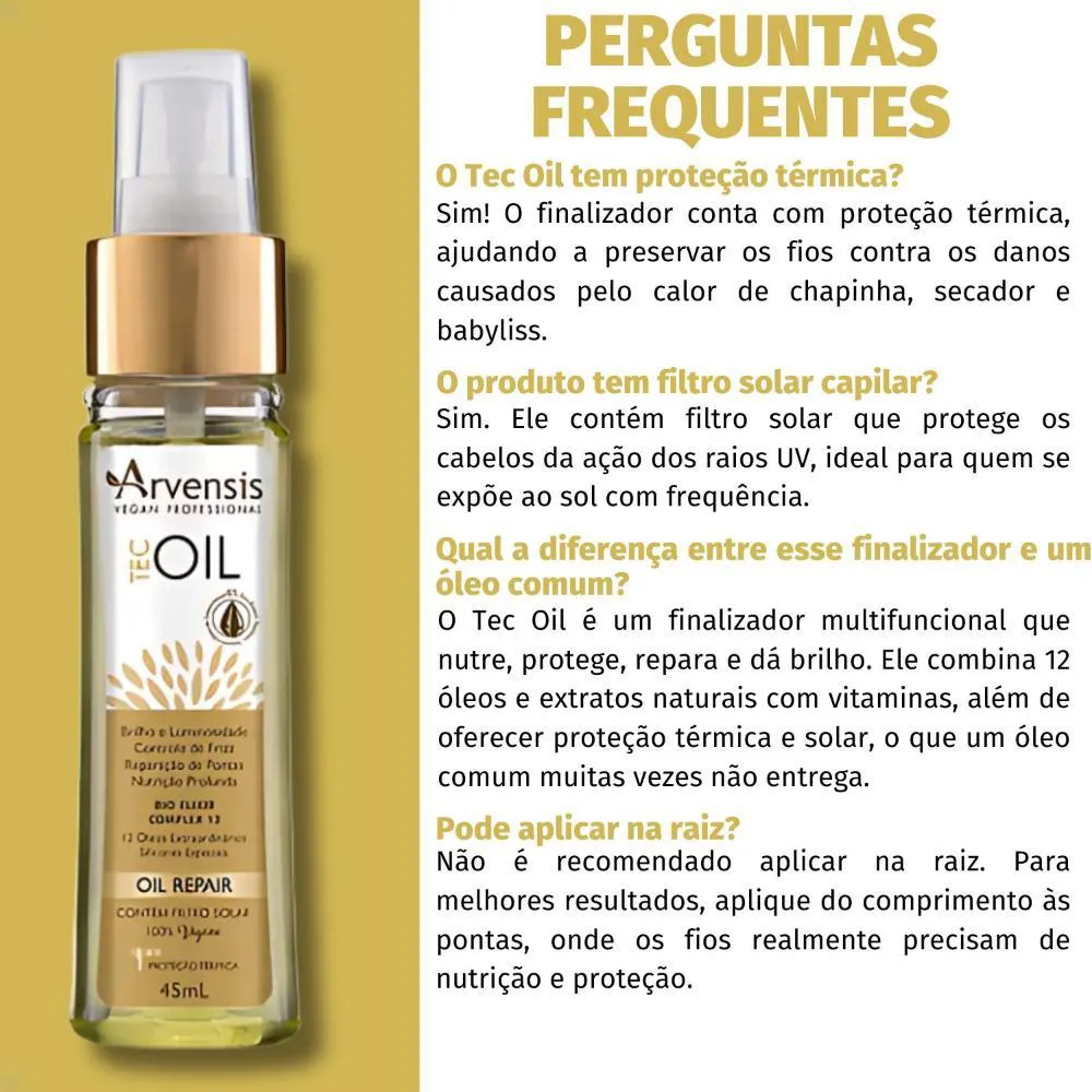 Finalizador Oil Repair Arvensis Tec Oil 45ml O Finalizador Oil Repair Arvensis Tec Oil é um tratamento capilar multifuncional de alto desempenho, formulado especialmente para cabelos que sofrem com ressecamento, pontas duplas, frizz e danos térmicos ou ambientais. Rico em 12 óleos e extratos vegetais altamente nutritivos, ele oferece reparação intensa, hidratação profunda e ação protetora em uma única aplicação. Sua textura leve, de toque seco e rápida absorção, garante um acabamento profissional: fios alinhados, sedosos, com brilho natural e sem pesar. Além disso, conta com proteção térmica e filtro solar capilar, formando uma barreira contra os danos do calor (chapinha, secador, babyliss) e da exposição ao sol. . Modo de usar: Com os cabelos secos ou úmidos, aplicar sobre a palma das mãos, friccionar e espalhar do comprimento às pontas. Finalizar como desejar. Precauções: Somente para uso externo. Manter fora do alcance de crianças. Caso occorer alguma irritação, suspender o uso. Manter em local fresco e longe da iluminação solar. . Perguntas Frequentes O Tec Oil tem proteção térmica? Sim! O finalizador conta com proteção térmica, ajudando a preservar os fios contra os danos causados pelo calor de chapinha, secador e babyliss. O produto tem filtro solar capilar? Sim. Ele contém filtro solar que protege os cabelos da ação dos raios UV, ideal para quem se expõe ao sol com frequência. Qual a diferença entre esse finalizador e um óleo comum? O Tec Oil é um finalizador multifuncional que nutre, protege, repara e dá brilho. Ele combina 12 óleos e extratos naturais com vitaminas, além de oferecer proteção térmica e solar, o que um óleo comum muitas vezes não entrega. Pode aplicar na raiz? Não é recomendado aplicar na raiz. Para melhores resultados, aplique do comprimento às pontas, onde os fios realmente precisam de nutrição e proteção. Pode ser usado como finalizador após escova ou chapinha? Sim! Ele é excelente para dar acabamento, selar as pontas e eliminar o frizz após o uso de fontes de calor. . Código de Registro Sanitário (ANVISA) 25351.039787/2015-35