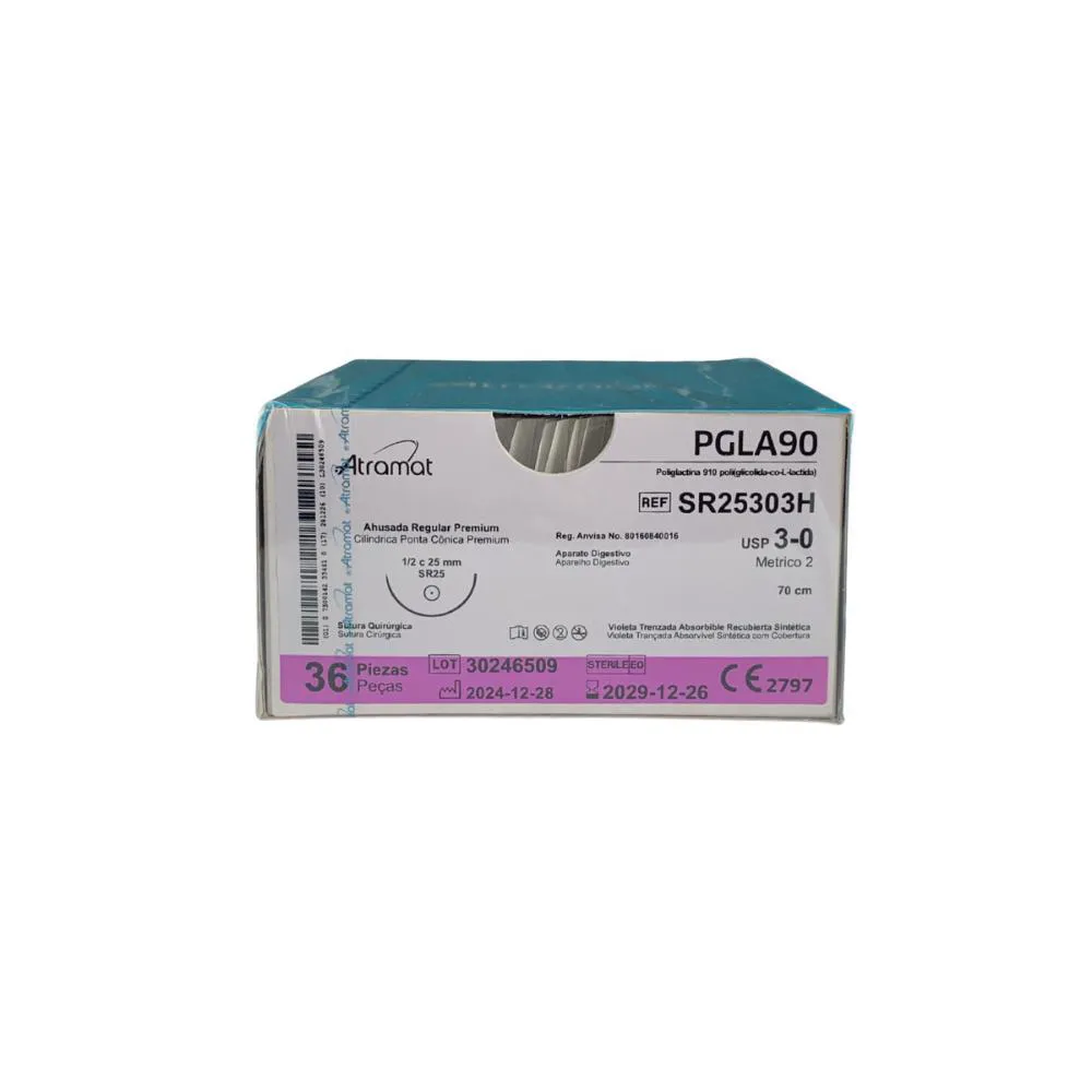 O Fio de Sutura Poliglactina 910 Violeta 3-0 da Atramat é um fio cirúrgico absorvível sintético, altamente confiável, conhecido por sua alta resistência inicial, manuseio suave e absorção previsível. Fabricado a partir de copolímero de ácido glicólico e ácido lático, é a solução ideal para fechamento de tecidos moles em procedimentos que demandam suporte temporário.Acompanha agulha cilíndrica de 26 mm com ponta cônica premium, projetada para penetração atraumática em tecidos sensíveis. Indicado para uso em cirurgias ginecológicas, plásticas, odontológicas e gerais.Modelos Disponíveis