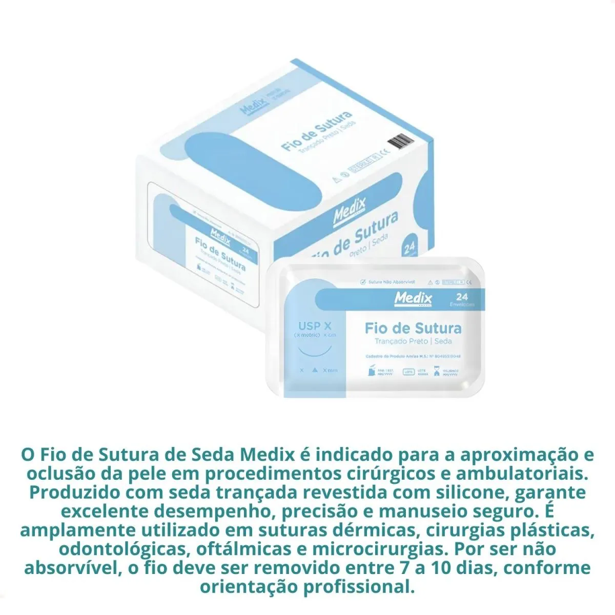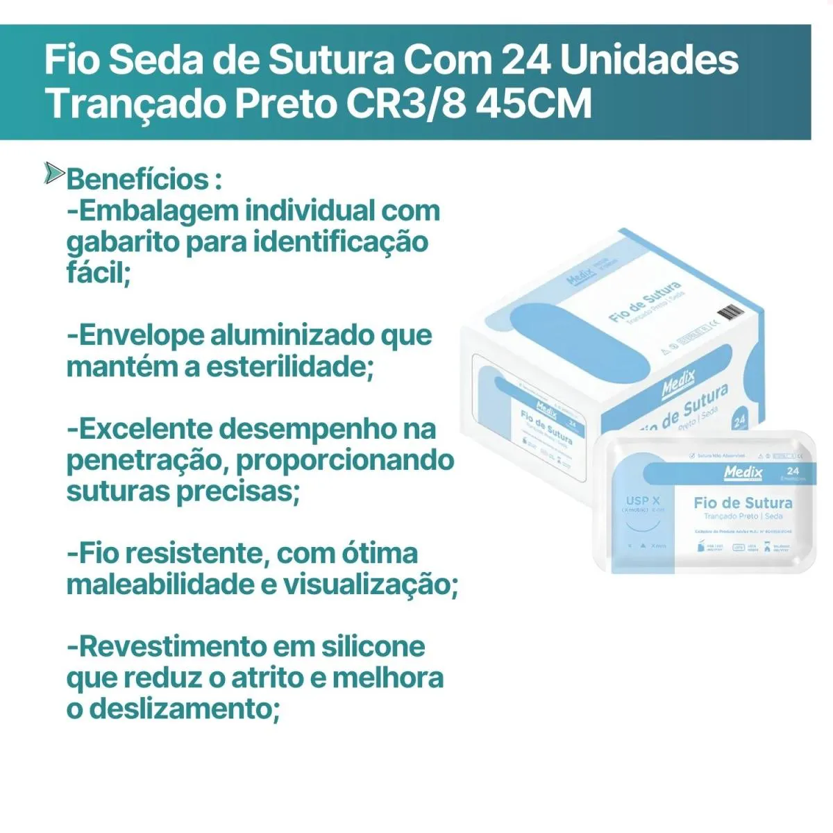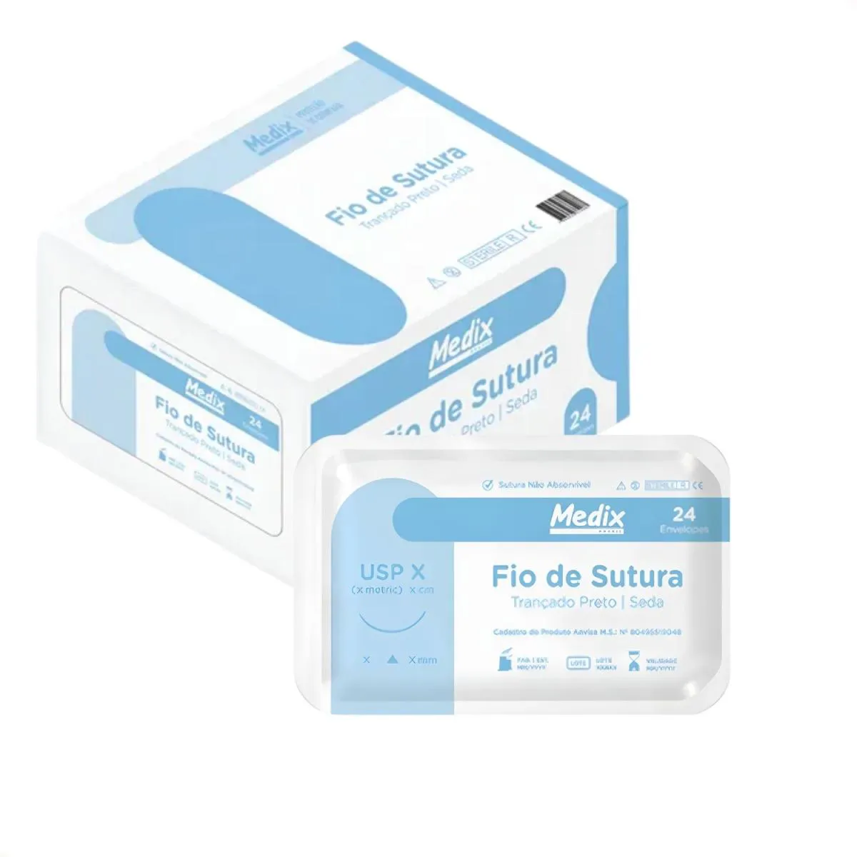 O que é: Um fio de sutura não absorvível, produzido com seda trançada revestida com silicone, com diâmetro 3.0, comprimento de 45 cm e agulha de 17mm com curvatura 3/8 triangular. Para que serve: Indicado para aproximação e oclusão da pele em procedimentos cirúrgicos e ambulatoriais, sendo utilizado em suturas dérmicas, cirurgias plásticas, odontológicas, oftálmicas e microcirurgias, com função de aproximar e lacear tecidos moles, realizar suturas cutâneas e subcutâneas em procedimentos que exigem resistência e estabilidade.Benefícios