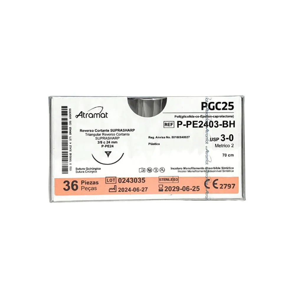 O Fio de Sutura Poliglicolida - Caprolactona Incolor 3-0 - P-PE2403-BH da Atramat é um fio cirúrgico sintético, monofilamentar e absorvível, indicado para suturas que exigem resistência inicial, manuseio suave e excelente resultado estético. Fabricado em Poliglicolida Caprolactona (PGLA), combina alta performance com absorção previsível e mínima reação inflamatória. Equivalente técnico ao Monocryl Y936H, oferece deslizamento preciso, biocompatibilidade superior e excelente acabamento em cirurgias plásticas, odontológicas e ginecológicas.Embalagem: