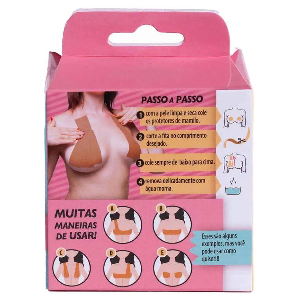 A embalagem possui 5 metros e você pode levantar os seios e utilizar de acordo com o seu tipo de roupa tomara que caia, decotes profundos, um ombro só.... O tecido é respirável e por isso, sustenta com conforto. Junto com a fita vem 10 disquinhos de proteção da aréola.