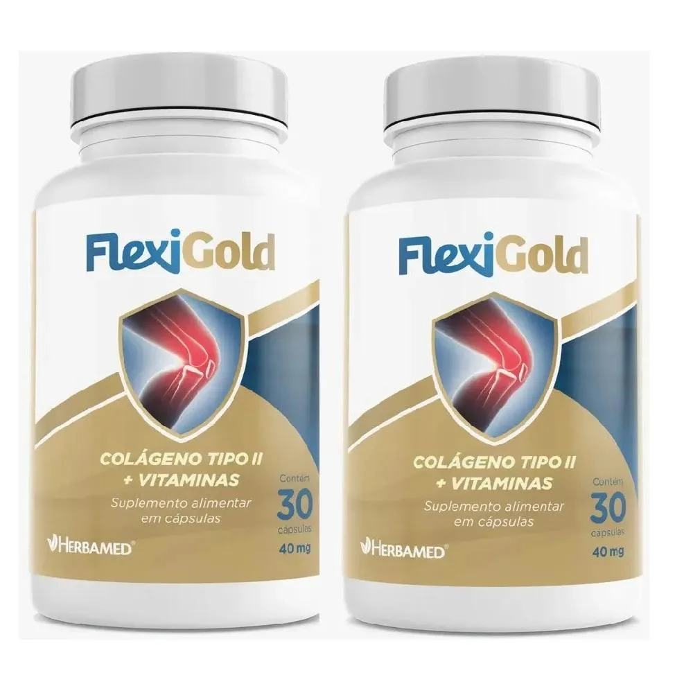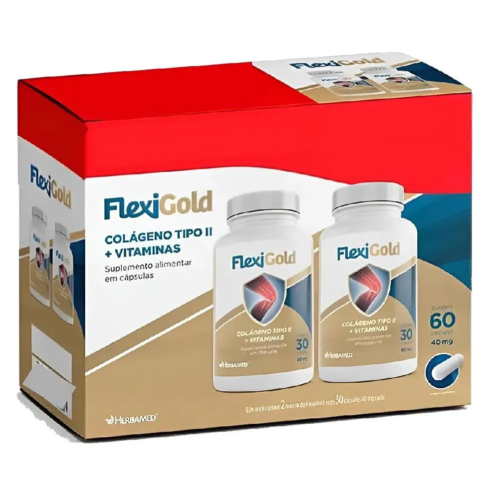Descubra o Flexigold Special Pack da Herbamed, uma combinação perfeita de colágeno tipo 2 e uma seleção de vitaminas essenciais. Cada cápsula contém uma dose equilibrada de Colágeno Tipo 2 (40mg), vitamina c (45mg), vitamina e (10mg) e complexo de Vitaminas do complexo B, que irão auxiliar na nutrição da pele, cabelos e unhas. Ingredientes Colágeno tipo 2, vitamina C revestida (ácido ascórbico), acetato de tocoferol (vitamina E), nicotinamida (vitamina B3), piridoxina (vitamina B6), tiamina (vitamina B1), cianocobalamina (vitamina B12), silicato de magnésio. Cápsula: gelatina, água purificada, umectante glicerina e dióxido de titânio. Recomendação de uso: 1 cápsula ao dia prefêrencialmete próximos as refeições ou conforme orientação de um profissional. Recomendado para grupo populacional acima de 19 anos. Este produto não deve ser consumido por gestantes, lactantes ou criançãs. NÃO CONTÉM GLÚTEN. Produto isento de registro conforme RDC 240/2018.