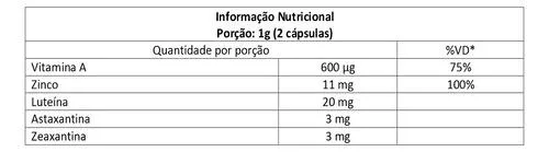 Luteína da flor de tagetes erecta, bisglicinato de zinco, ésteres de astaxantina de haematococcus pluvialis, zeaxantina da flor tagetes erecta, acetato de retinol (vitamina a), antiumectantes (dióxido de silício e estearato de magnésio). Composição da cápsula: gelatina.