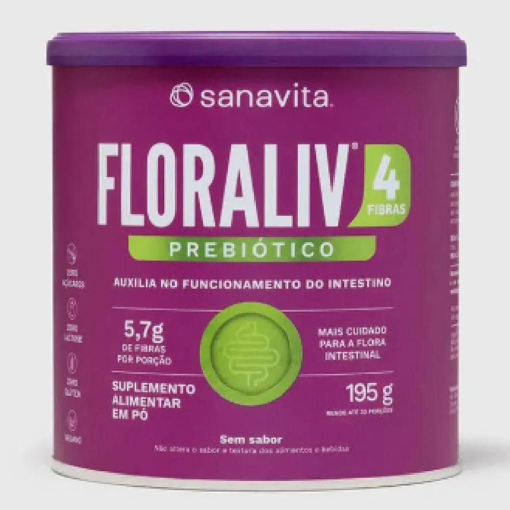 A Floraliv 4 fibras Prebiótico Sanavita é um suplemento formulado com uma combinação exclusiva de quatro fibras vegetais 100% solúveis: inulina, goma acácia, frutooligossacarídeos (FOS) e polidextrose. Cada porção fornece 5,7 g de fibras, facilitando a inclusão desse nutriente na rotina diária.