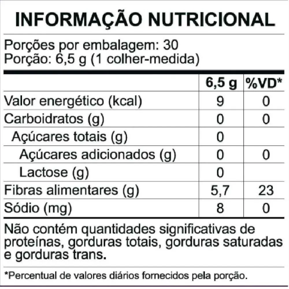 Goma Acácia: Fibra solúvel prebiótica, 100% vegetal, com alta tolerância digestiva e baixo valor energético, associada ao equilíbrio da microbiota e ao funcionamento intestinal.Inulina: Fibra solúvel extraída da raiz da chicória, fermentável e não digerível, que auxilia o equilíbrio da microbiota intestinal.Frutooligossacarídeos (FOS): Fibra solúvel prebiótica obtida por fermentação natural da cana-de-açúcar, associada a efeitos positivos sobre a microbiota intestinal.Polidextrose: Fibra solúvel de baixo índice glicêmico e baixo valor energético, com ação prebiótica e benefícios para o intestino e a saciedade.Sugestão de consumo: