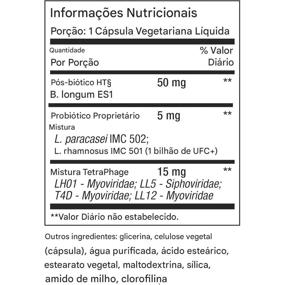 As cápsulas fornecem probióticos e fagos que apoiam a flora intestinal saudável, colaborando com processos digestivos e auxiliando na manutenção do equilíbrio natural do organismo.