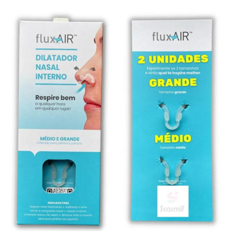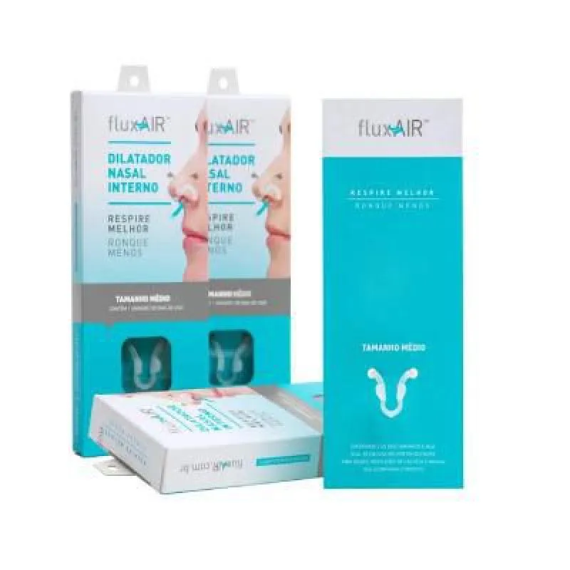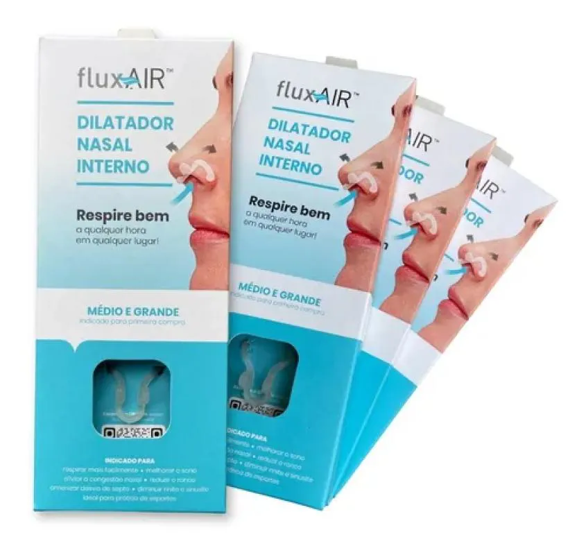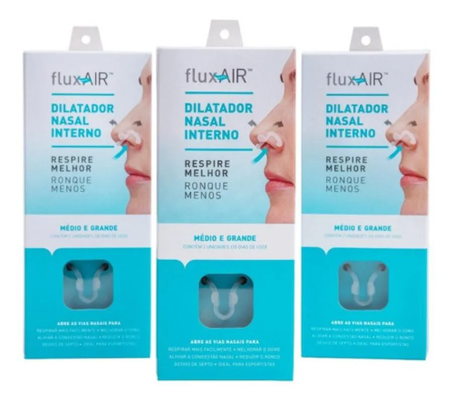Atenção: FluxAir dilatador nasal interno (acompanha uma caixa contendo duas unidades, sendo uma unidade de FluxAir do tamanho MÉDIO e outra do tamanho GRANDE para usar e verificar a que melhor se adapta ao seu nariz). ## ENTREGA RÁPIDA!! PRODUTO ORIGINAL e com NOTA FISCAL !! VENDEDOR AUTORIZADO !! VISÃO GERAL DO PRODUTO: O FluxAir é um dilatador nasal interno reutilizável, desenvolvido por médicos otorrinolaringologistas. O FluxAir abre e sustenta seu nariz, incentivando a respiração nasal e diminuindo a respiração pela boca, sem ação ou efeitos colaterais de medicamentos.Além disso, é constituído por polímero de silicone (grau médico), confortável e macio, atóxico, reciclável e pode ser usado com segurança. Pode ser utilizado por qualquer pessoa, inclusive crianças, por não haver contra indicações. VANTAGENS DO PRODUTO: ## Fácil de usar; ## Dilata as asas do nariz; ## Sem efeitos colaterais dos medicamentos; ## Desenvolvido por médicos otorrinolaringologistas; ## Fabricado em material antialérgico; # Não causa irritação na pele pelo uso contínuo; # Reutilizável por 30 dias; # Dispositivo interno e discreto; # Não deixa marcas na pele; # Não cai durante o uso. BENEFÍCIOS CONSTATADOS: ## O dilatador nasal FluxAir proporciona diminuição da respiração bucal e o ronco, otimizando a oxigenação sanguínea. ## O FluxAir abre e sustenta seu nariz, incentivando a respiração nasal e diminuindo a respiração pela boca, sem ação ou efeitos colaterais de medicamentos. ## Ronque menos, durma melhor e acorde revigorado sem prejudicar o sono do seu par. OTIMIZE A RESPIRAÇÃO PARA MELHOR DESEMPENHO NOS ESPORTES: FluxAir ajuda a controlar a respiração nasal, provocando o aumento do fluxo de ar. Sua tecnologia ajuda a reduzir a energia exercida durante a respiração, minimizando a resistência na válvula nasal. Garanta que você obtenha a quantidade máxima de ar em cada respiração, aumentando o desempenho e rendimento nas atividades físicas. NOITES BEM DORMIDAS: O sono reparador é muito importante para ser deixado ao acaso. Muitos especialistas concordam que uma noite bem dormida é um dos melhores remédios. FluxAir foi projetado para se alcançar um sono de qualidade, mais profundo e sem interrupções. TAMBÉM É INDICADO PARA: diminuir o cansaço excessivo, congestão nasal, ronco, desvio de septo, rinite, proporcionando melhor disposição. Conteúdo da embalagem: 01 Caixa contendo 02 FluxAir (um do tamanho médio e outro do tamanho grande).