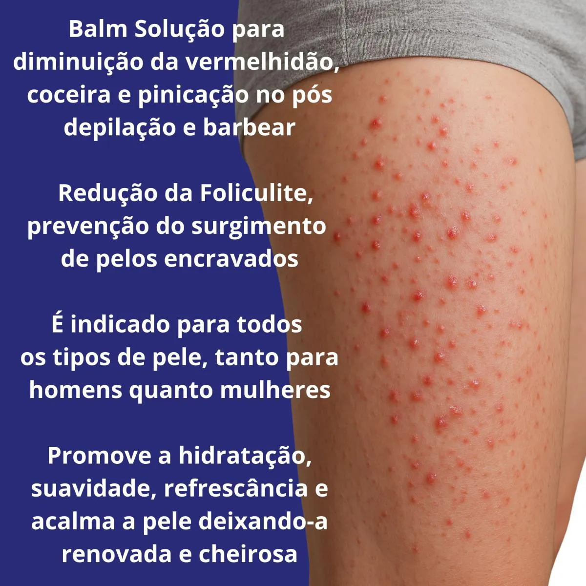 É um produto dermatológico que combate foliculite, previne pelos encravados, acalma irritações pós-depilação e uniformiza o tom da pele, proporcionando hidratação e conforto imediato.
