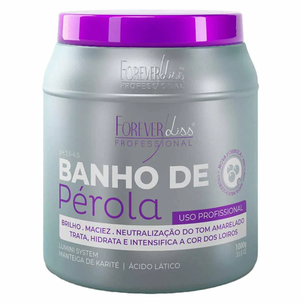 banho de Pérola Loiro Brilhante de Forever Liss é uma máscara hidratante e intensificadora da cor dos cabelos loiros, com ação neutralizadora de tons amarelados. Sua fórmula desenvolvida com tecnologia de última geração, exclusiva Forever Liss possui Lumini System, Manteiga de Karite e Ácido Latico que age instantaneamente a fim de hidratar, regenerar e nutrir profundamente os fios, neutralizando os tons amarelados.