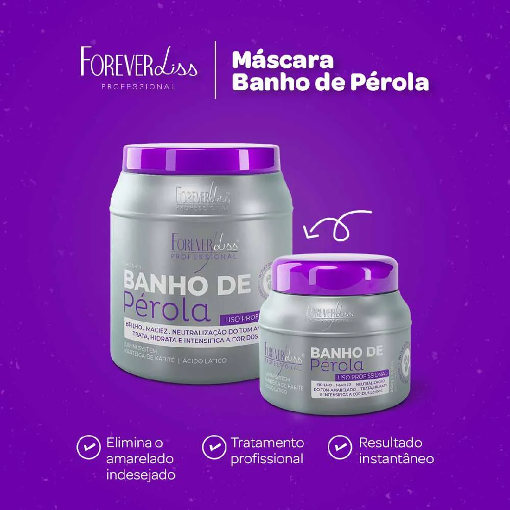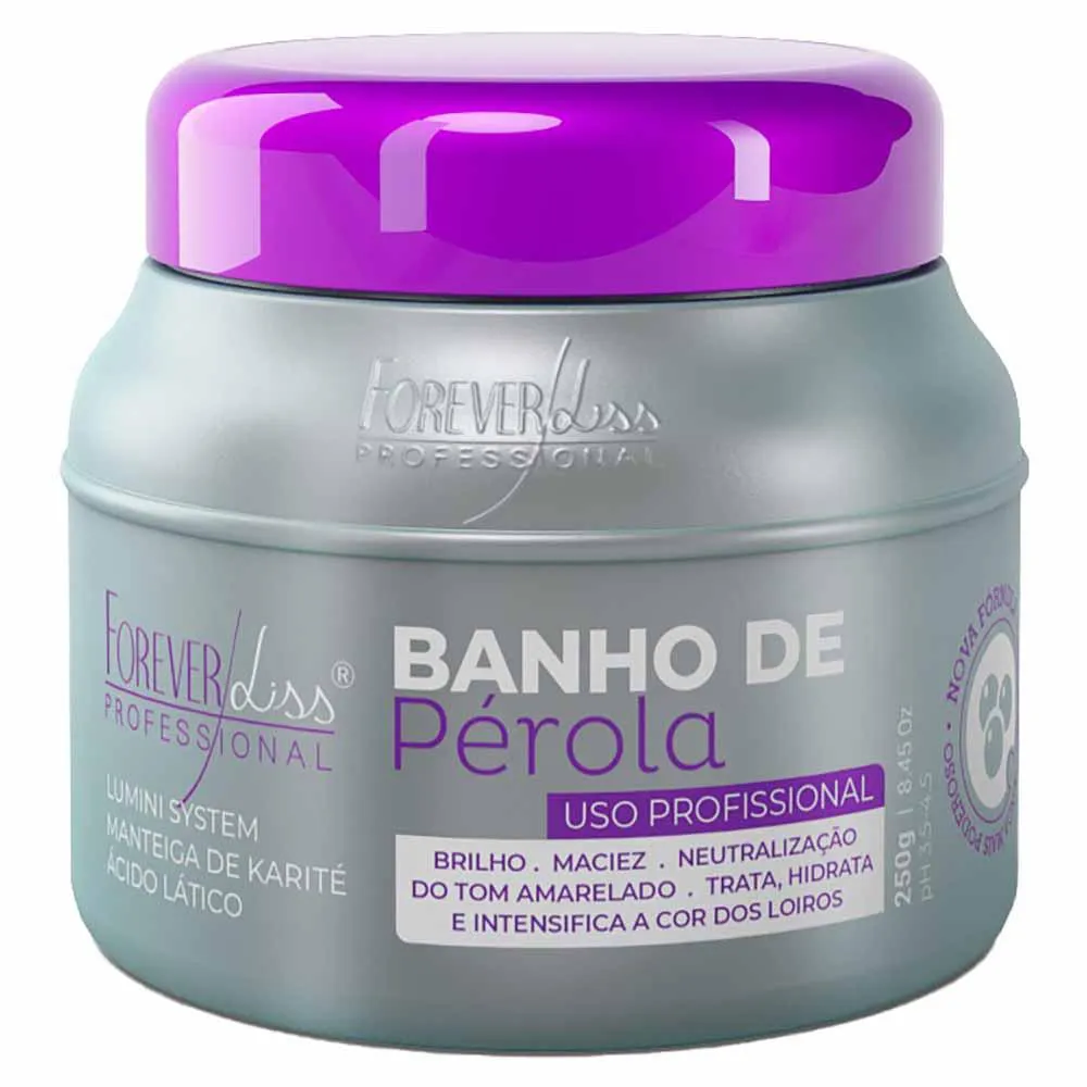 banho de Pérola Loiro Brilhante de Forever Liss é uma máscara hidratante e intensificadora da cor dos cabelos loiros, com ação neutralizadora de tons amarelados. Sua fórmula desenvolvida com tecnologia de última geração, exclusiva Forever Liss possui Lumini System, Manteiga de Karite e Ácido Latico que age instantaneamente a fim de hidratar, regenerar e nutrir profundamente os fios, neutralizando os tons amarelados.