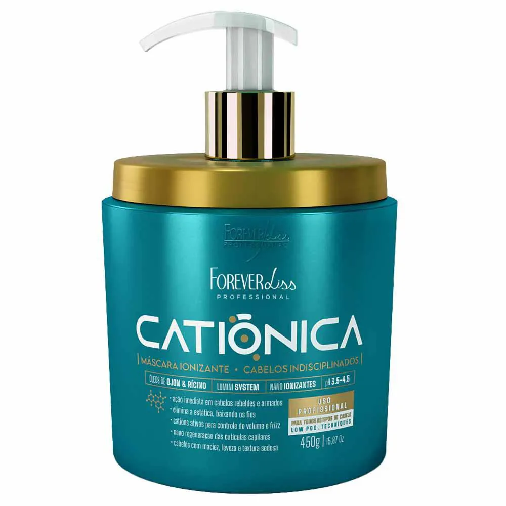 Máscara Catiônica Forever Liss 450g com alta tecnologia Top Profissional, única no mercado, contém em sua formulação Óleo de Ojon, Óleo de Rícino, Lumini System que além de hidratar e nutrir profundamente os fios, garante brilho tridimensional, restaurando toda a estrutura das cutículas capilares, dispõe de nanopartículas com cátions ativados que, ao entrarem em contato com os cabelos, imediatamente eliminam a estática (fios levantados e frizz elevado), corrigem a superfície capilar e faz com que os fios atraiam-se entre si. O resultado é um cabelo com maciez, leveza e movimento incomparáveis, fios totalmente disciplinado e com redução significativa do volume em instantes. Liberada para técnica de LOWPOO.