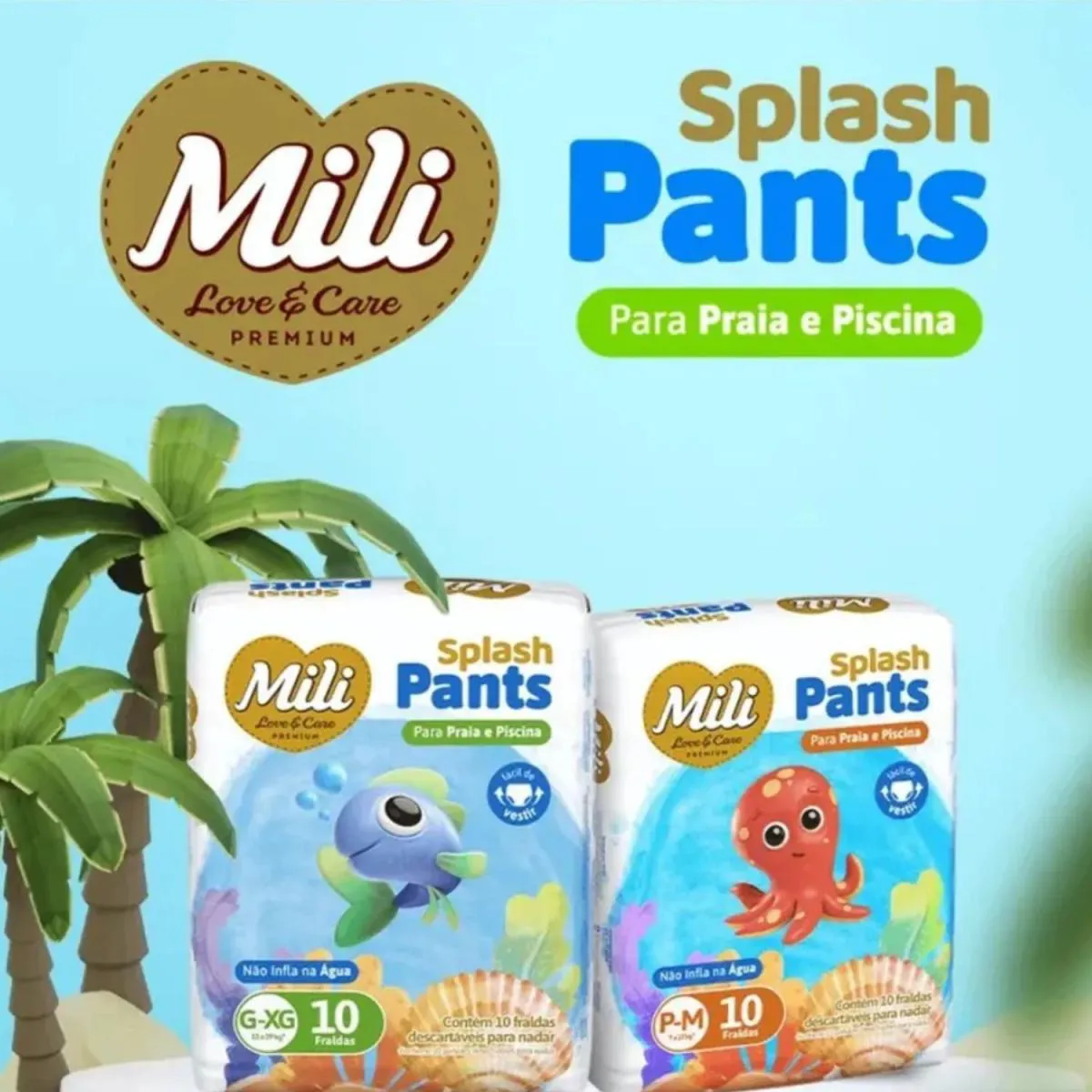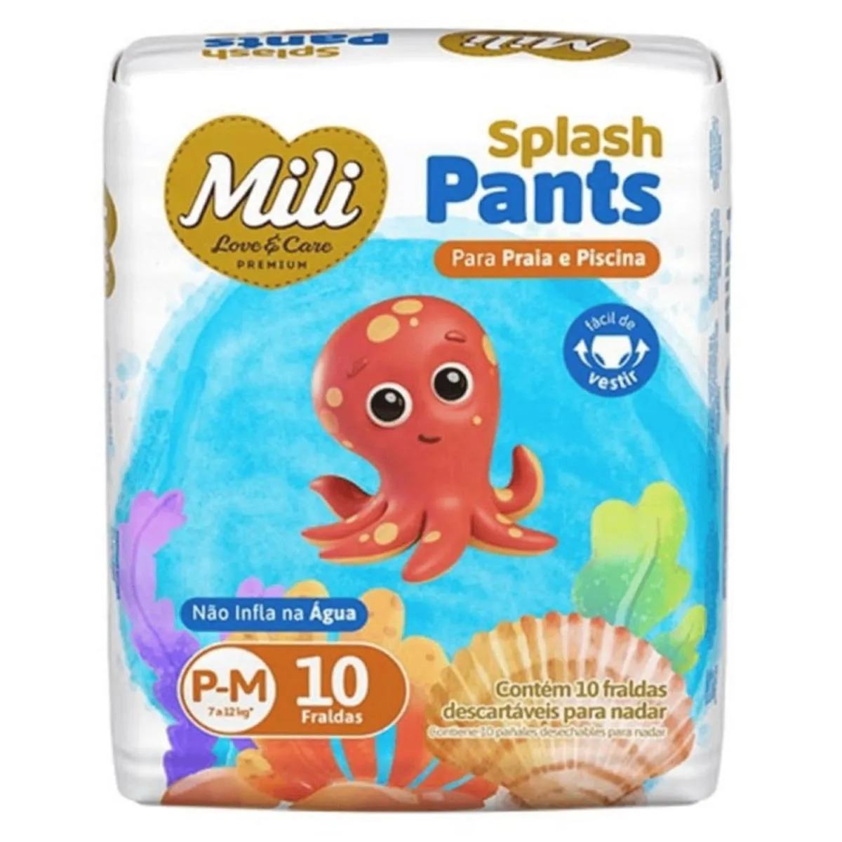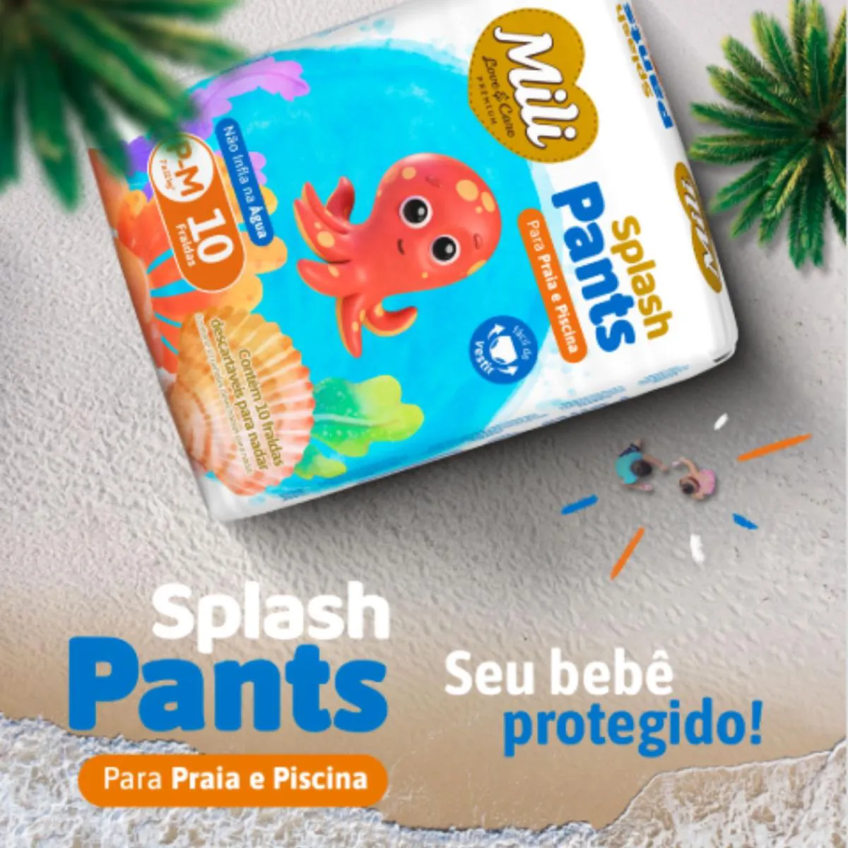fralda Mili Love Praia & Piscina Splash Pants P–M – Pacote com 10 unidades A Mili Love Splash Pants foi desenvolvida especialmente para momentos de diversão na praia e na piscina. Com tecnologia que não incha na água, ela mantém o ajuste perfeito, oferecendo conforto e proteção enquanto o bebê brinca. Diferenciais