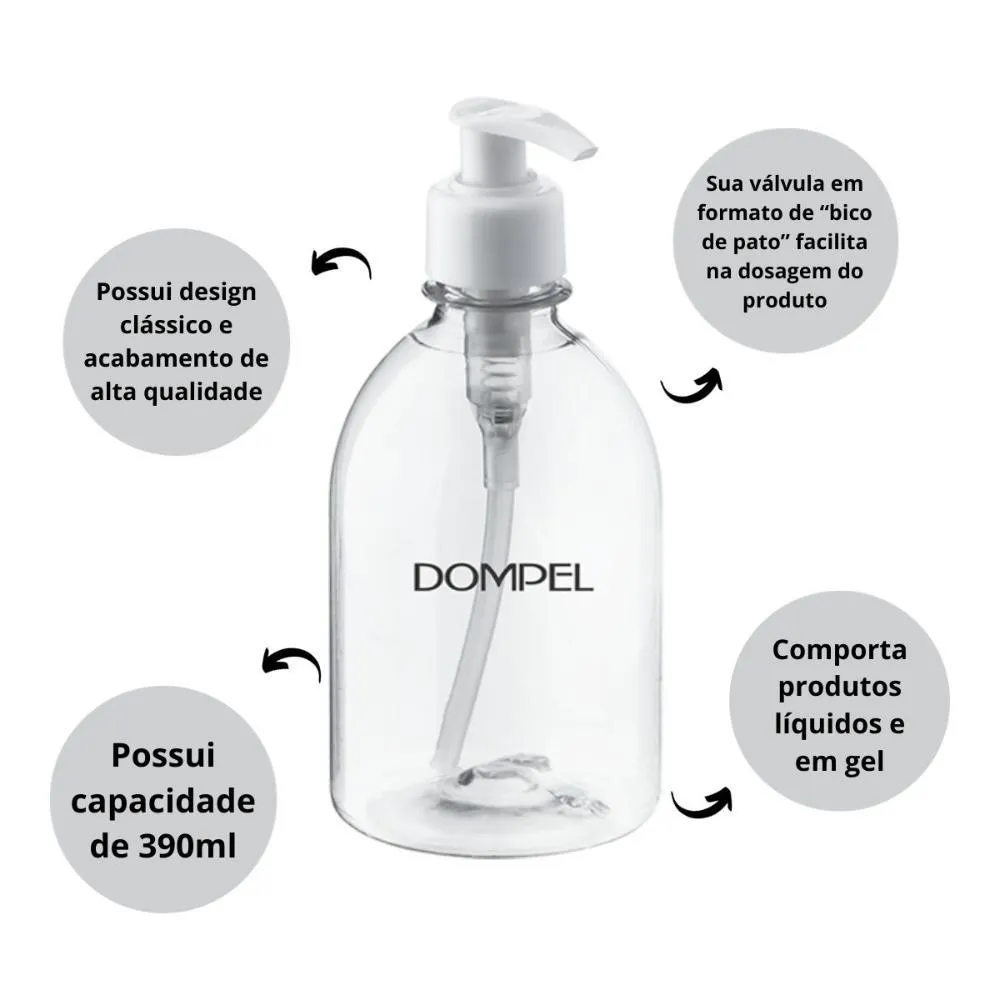Frasco Valvula Pump 390ml O frasco com Válvula Pump Dompel possui design clássico e acabamento de alta qualidade. Sua válvula em formato de “bico de pato” facilita na dosagem do produto. Fabricado em material PET transparente, possui capacidade de 390ml. Comporta produtos líquidos e em gel. . Diâmetro: 7,40 cm Altura: 16,70 cm . Referências: 4524 . Composição Plástico.
