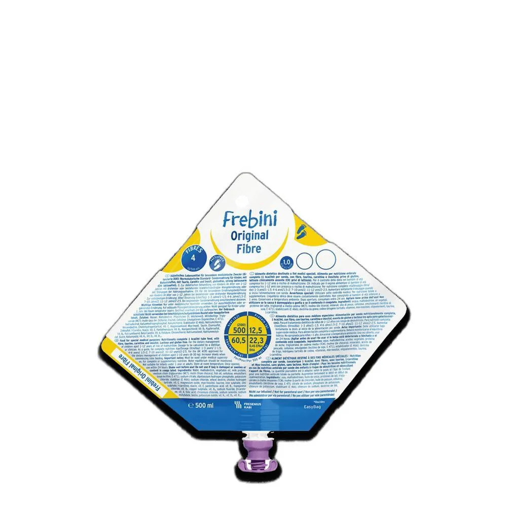 Frebini Original Fibre é uma dieta enteral líquida pediátrica, polimérica, nutricionalmente completa, normocalórica (1 Kcal/ml). Com 10% de proteína (caseína e proteína do soro de leite), 50% de carboidrato (maltodextrina) e 40% de lipídio (óleo de canola, TCM e óleo de peixe). Com adição de fibras solúveis e insolúveis e isenta de glúten. Embalagem: Easy Bag de 500ml.Indicação