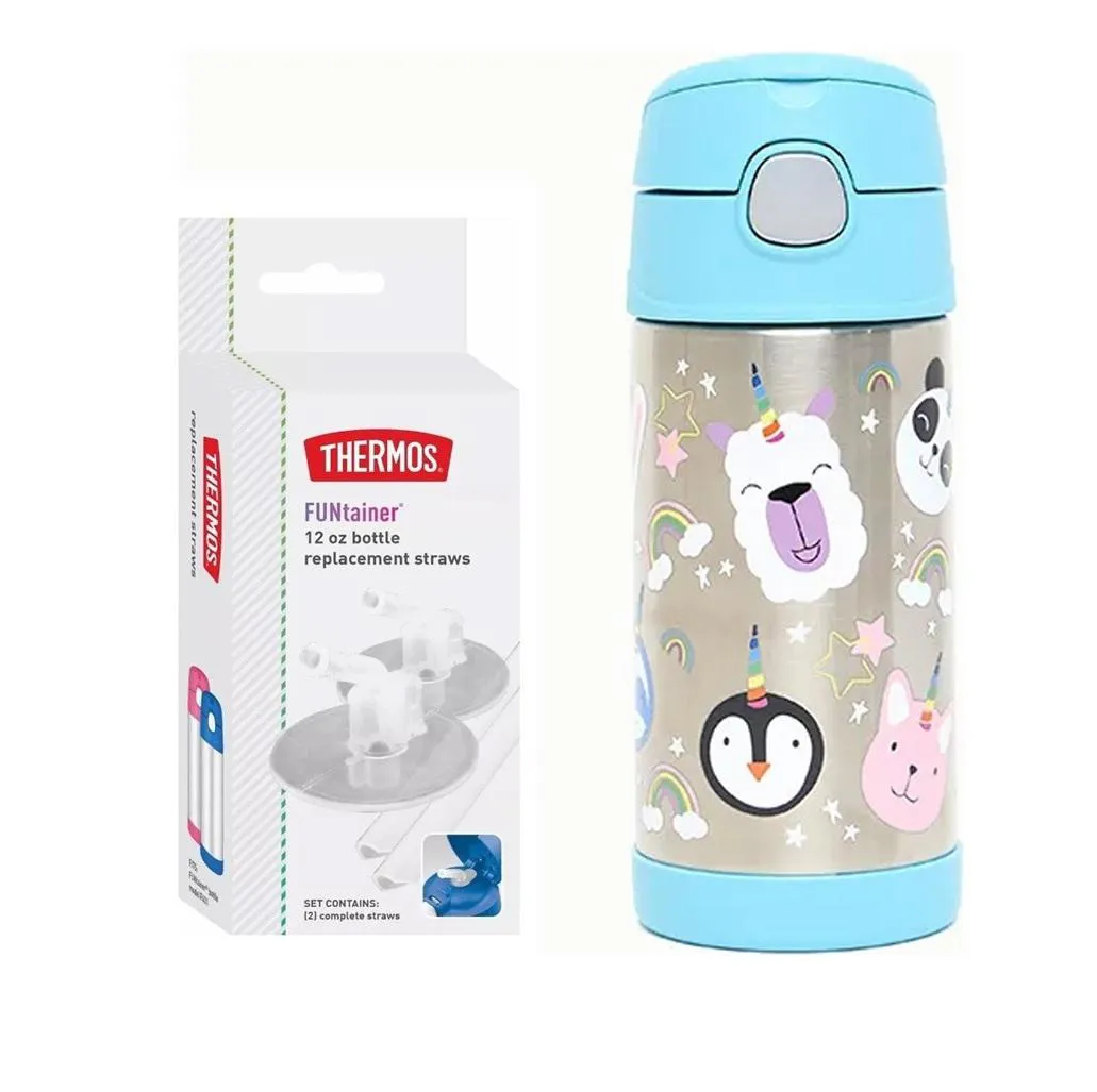 Garrafinha Térmica Funtainer 355Ml + Canudos Refil Thermos Animais