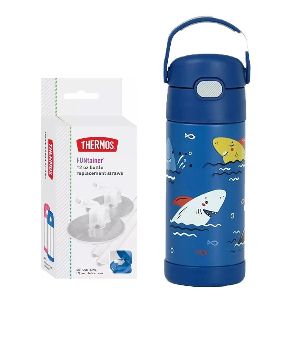 Garrafinha Térmica Funtainer 355Ml + Canudos Refil Thermos Tubarão