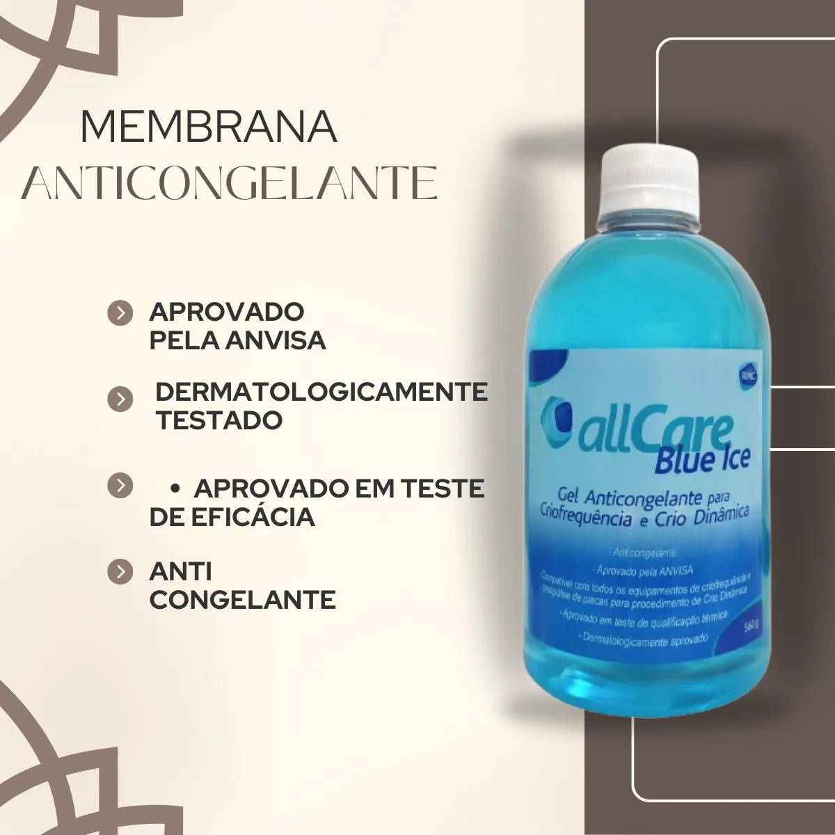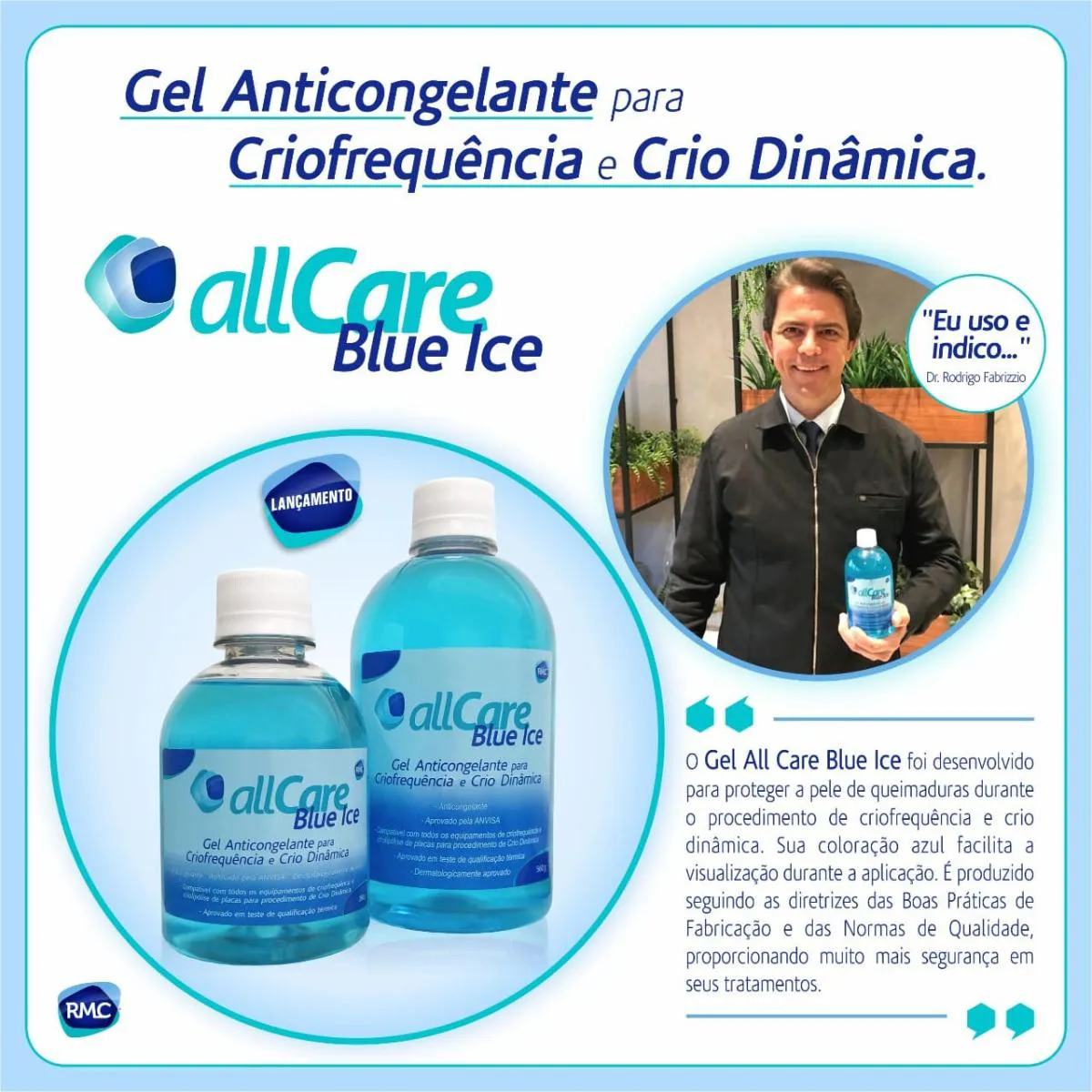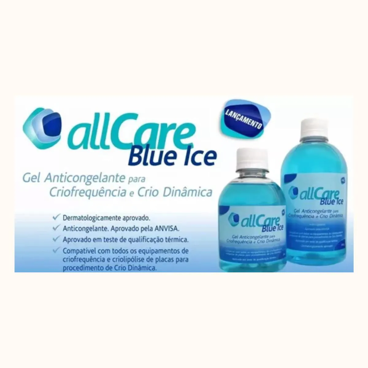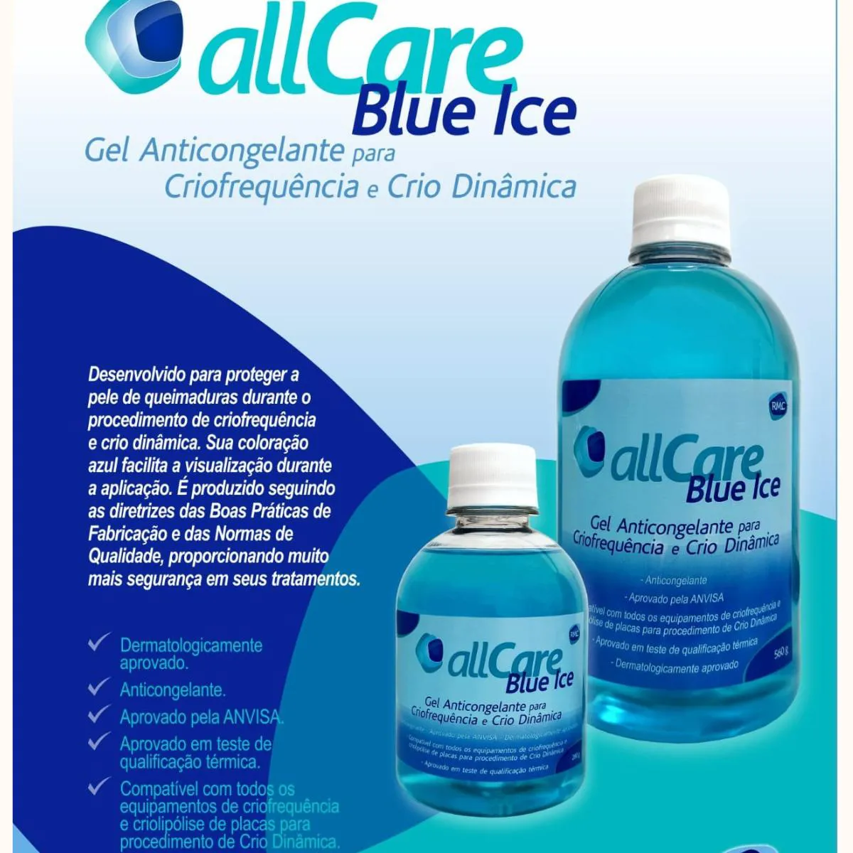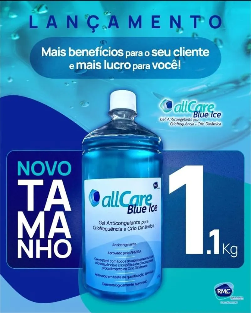 1,1 KG FRASCO Gel Anticongelante para Criofrequência e Crio Dinâmica. O Gel AllCare Blue Ice foi desenvolvido para proteger a pele de queimaduras durante o procedimento de criolipólise com movimento. – Compatível com todos os equipamentos de criofrequência e criolipólise de placas, para procedimento de Crio Dinâmica.- Anticongelante