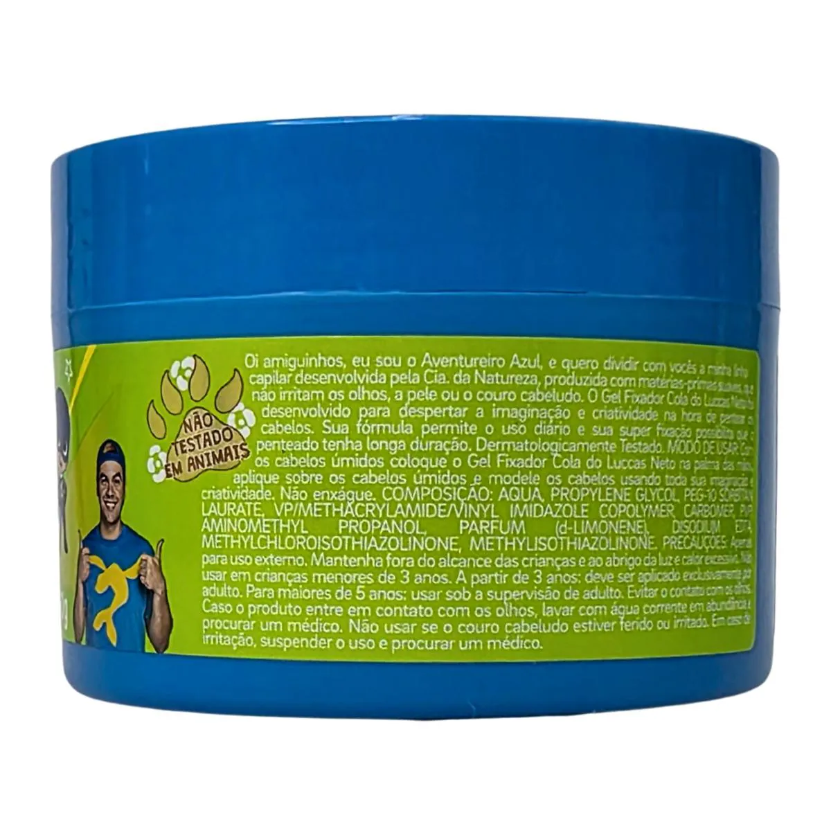 Finalidade: Oi amiguinhos, eu sou o Aventureiro Azul e quero dividir com vocês a minha linha capilar desenvolvida pela Cia. da Natureza, produzida com matérias-primas suaves, que não irritam os olhos, a pele ou o couro cabeludo. O Gel Fixador Cola Os Aventureiros do Luccas Neto foi desenvolvido para despertar a imaginação e criatividade na hora de pentear os cabelos. Sua fórmula permite o uso diário e sua super fixação possibilita que o penteado tenha longa duração.