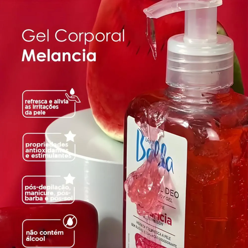 Hidratação refrescante e sensação de leveza para a pele após depilação, exposição solar, barbear ou cuidados diários, deixando a pele macia, revitalizada e perfumada desde a primeira aplicação. Sua fórmula é enriquecida com extrato natural de melancia, conhecido por suas propriedades hidratantes e antioxidantes, que ajudam a acalmar a pele, reforçar a barreira protetora e promover sensação de frescor prolongado ? sem álcool e com rápida absorção, ideal para todos os tipos de pele. Ideal para uso após depilação, manicure, pós-barba ou exposição ao sol, o gel possui textura leve, não oleosa e de fácil aplicação, contribuindo para uma pele mais suave, confortável e com aparência saudável. Indicado para quem busca sensação de bem-estar diária com toque sedoso e refrescante, transformando o cuidado corporal em um momento de conforto e cuidado completo.