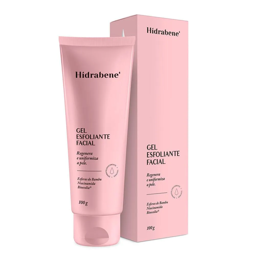 Pele renovada, uniforme, macia e radiante. Hidrabene Gel esfoliante Facial é indicado para todos os tipos de pele e promove através das esferas naturais de bambu, uma esfoliação física suave removendo o acúmulo de sujeiras e células mortas. Contém, ainda, ativos que suavizam, promovem hidratação e estimulam a proteção natural da microbiota da pele. Produto dermatologicamente testado, hipoalergênico, formulado de maneira a minimizar possível surgimento de alergia.