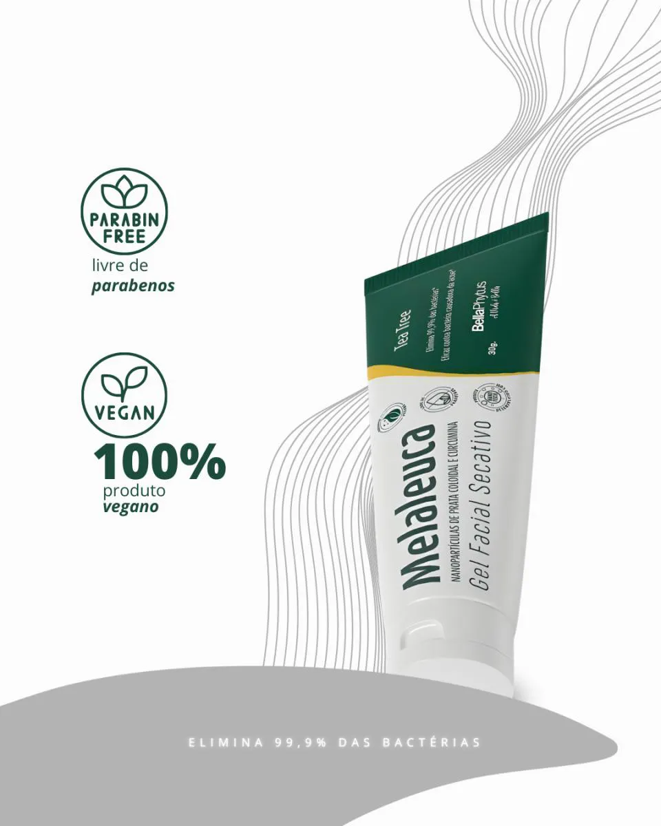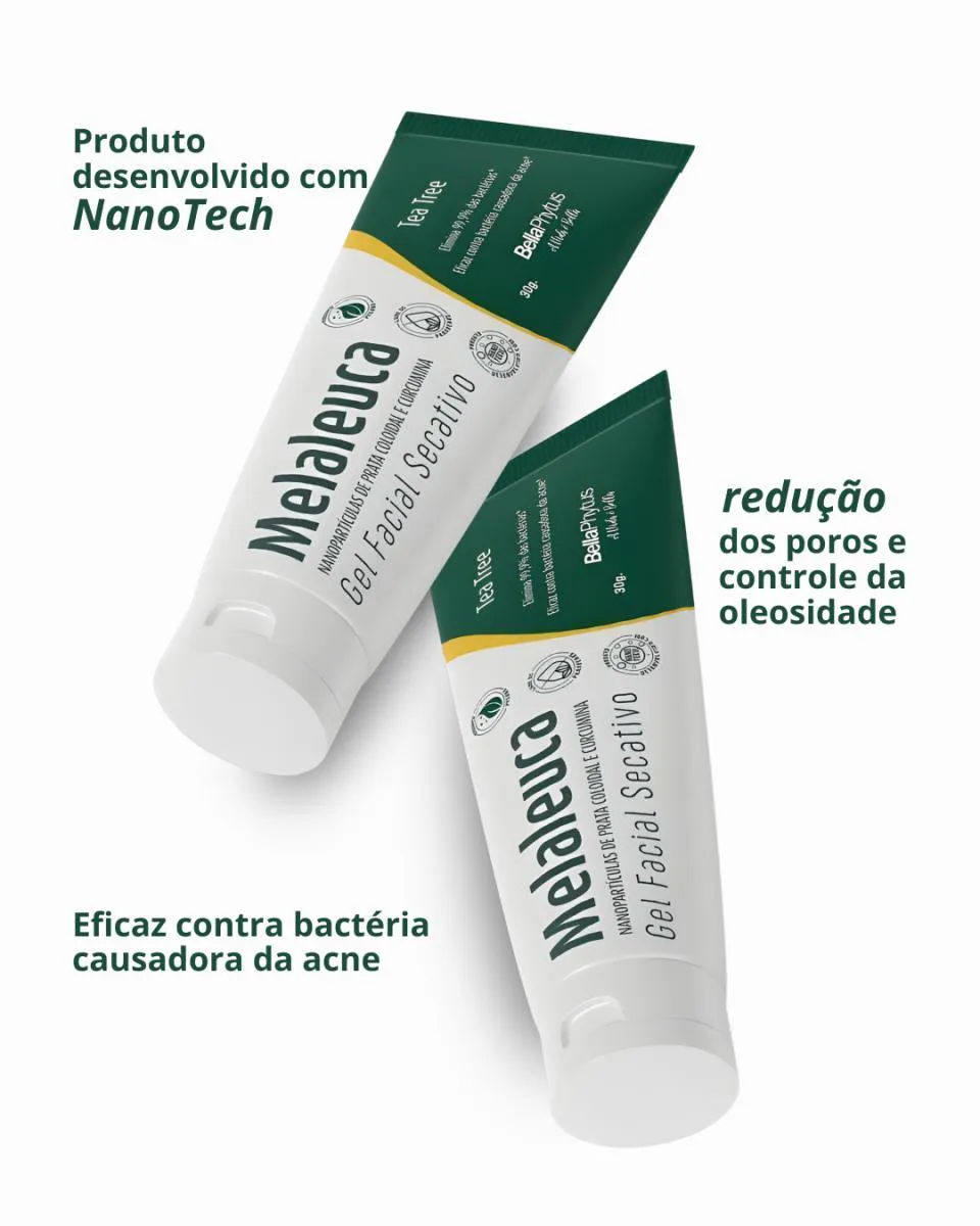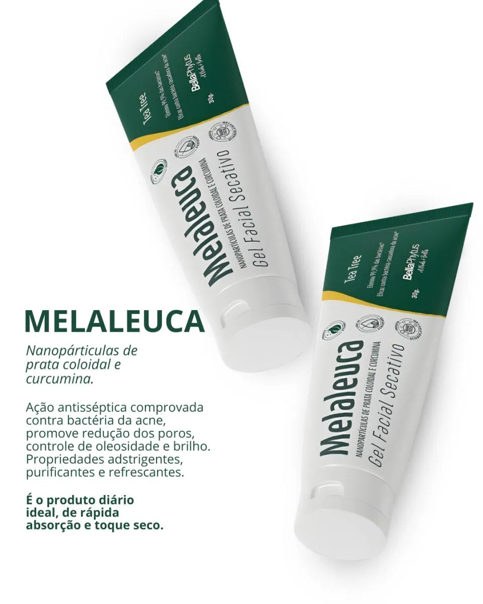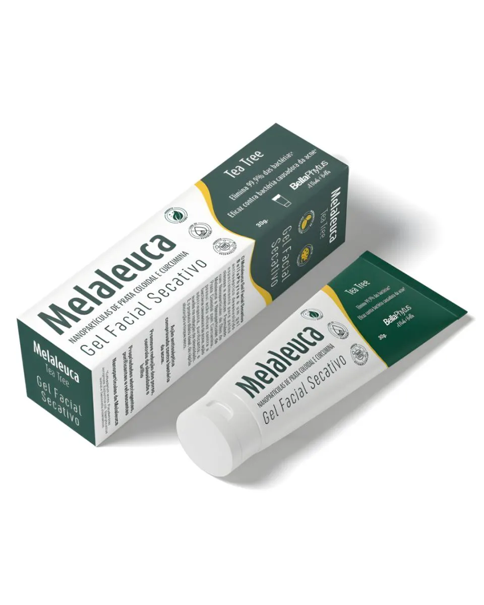 Melaleuca Gel Secativo de Espinhas Tea Tree 30g O Melaleuca- Gel Facial Secativo Bellaphytus é um gel antisséptico de rápida absorção e toque seco, redutor da oleosidade e eficaz contra a bácteria causadora da acne, com ação adstringente e purificante. BENEFÍCIOS -Propriedades adstringentes, anti-inflamatórias, purificantes e refrescantes; -Promove redução dos poros, controle de oleosidade e brilho; -Melhora a pele acneica; -Ação antisséptica, eficaz contra a bactéria da acne; -Com curcumina; -A nanotecnologia presente no produto faz com que ele tenha alta performance, penetração na pele e eficácia; -99,99% de atividade antibacteriana frente aos microorganismos, incluindo a Cutiumbacterium acnes, principal causadora da acne. MODO DE USO Aplique o produto após a higienização do rosto, pela manhã e pela noite, com movimentos circulares até completa absorção. Após o uso pela manhã, utilize o protetor solar. PRECAUÇÕES Mantenha o produto fora do alcance de crianças. Em caso de contato acidental com os olhos, enxaguar abundantemente com água. Não usar se a pele estiver irritada ou lesionada. Havendo irritação, suspenda o uso e procure orientação médica. Uso externo. É o produto diário ideal, de rápida absorção e toque seco.