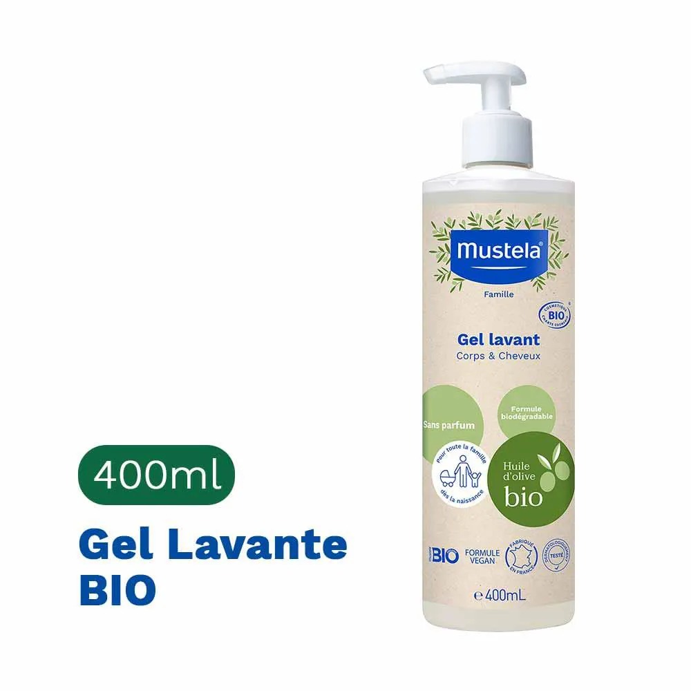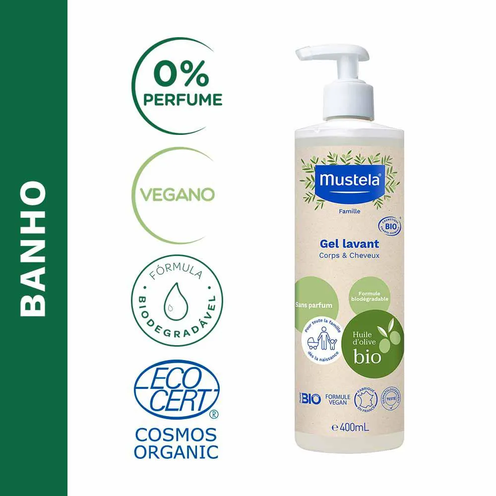 Gel Lavante BIO com Azeite de Oliva e Aloe Vera Orgânicos, foi especialmente formulado para limpeza suave do corpo e cabelo de toda a família, desde o nascimento. O Gel Lavante BIO possui pH fisiológico. Sem perfume e sem sabão. Sua formulação com 50% do total de ingredientes provenientes da agricultura orgânica e 97% de ingredientes de origem natural, deixa a pele macia e limpa. Propriedades: • Azeite de Oliva BIO: rico em ômega 6 e 9, com propriedades nutritivas para a pele. • Aloe Vera BIO: acalma e suaviza a pele. Para respeitar o meio ambiente, as pessoas e minimizar o seu impacto. O Gel Lavante BIO possui fórmula biodegradável, vegana e sua embalagem é feita a partir da cana-de-açúcar. Conheça a linha completa Mustela BIO, feita para cuidar da pele de toda a família, desde o nascimento. Princípio Ativo: Azeite de Oliva BIO + Aloe Vera BIO. Modo de Uso: Aplicar Gel Lavante BIO com Azeite de Oliva e Aloe Vera Orgânicos 400 ml no corpo e no cabelo molhados durante o banho e massagear suavemente. Enxaguar.