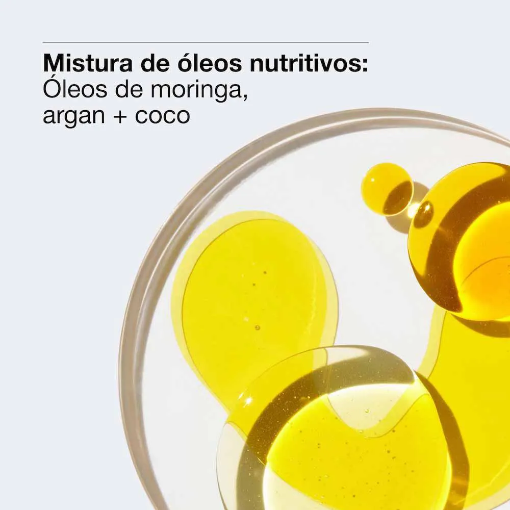 - Enriquecido com óleo de coco, argan e moringa que condicionam os pelos;