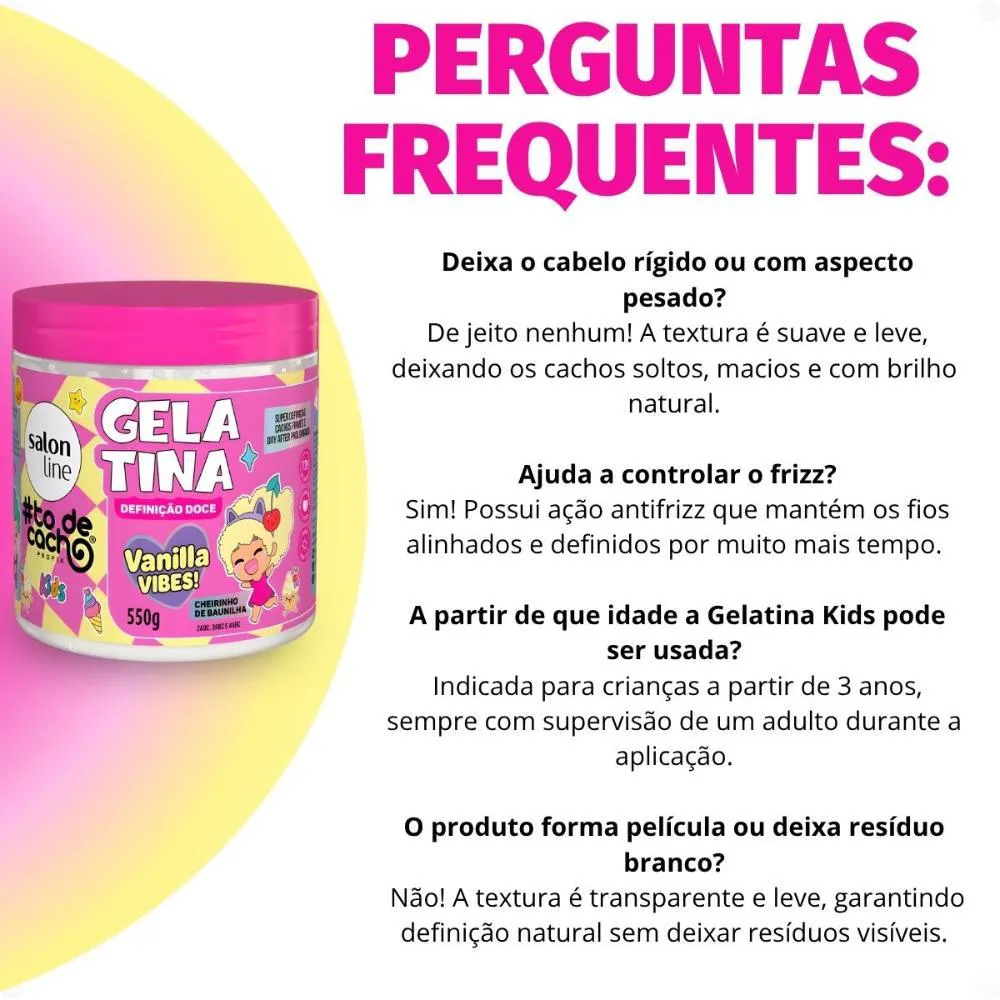 A Gelatina Capilar Salon Line Kids Vanilla Vibes! #ToDeCacho Definição Doce 550g é a solução ideal para proporcionar uma definição suave e natural aos cachos das crianças. Desenvolvida pela SALON LINE, esta gelatina oferece brilho intenso e controle eficaz do frizz, transformando a rotina de cuidados capilares em um momento divertido e perfumado. Sua fórmula é enriquecida com Extrato de Baunilha, Extrato de Cereja e Óleo de Semente de Uva, garantindo cachos definidos, saudáveis e com um delicioso aroma de baunilha, sendo perfeita para cabelos ondulados, cacheados e crespos.Benefícios Principais