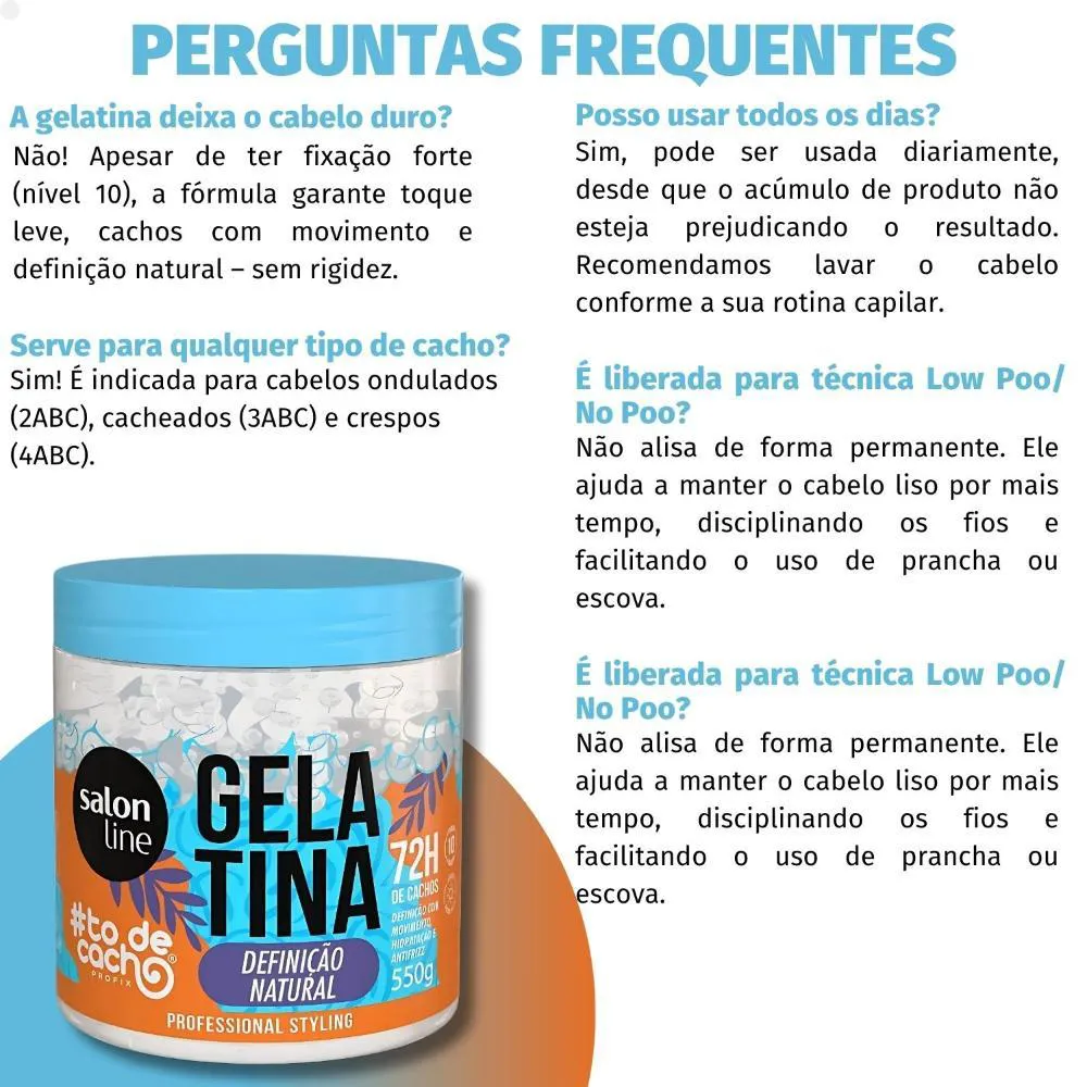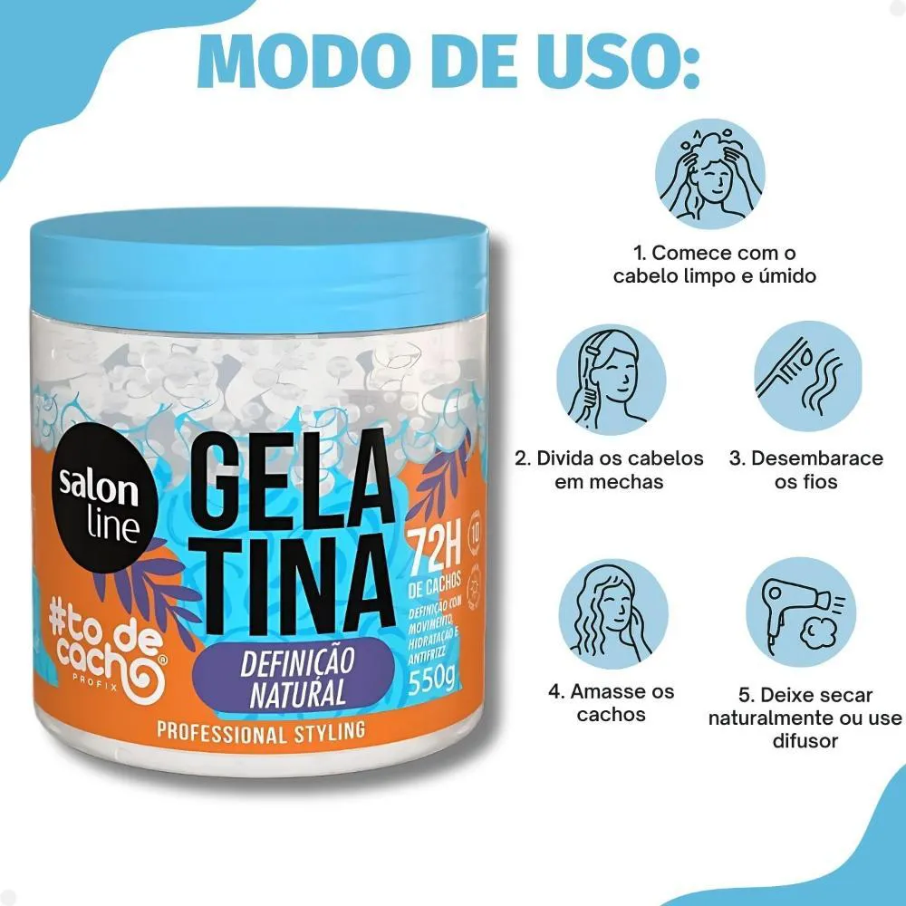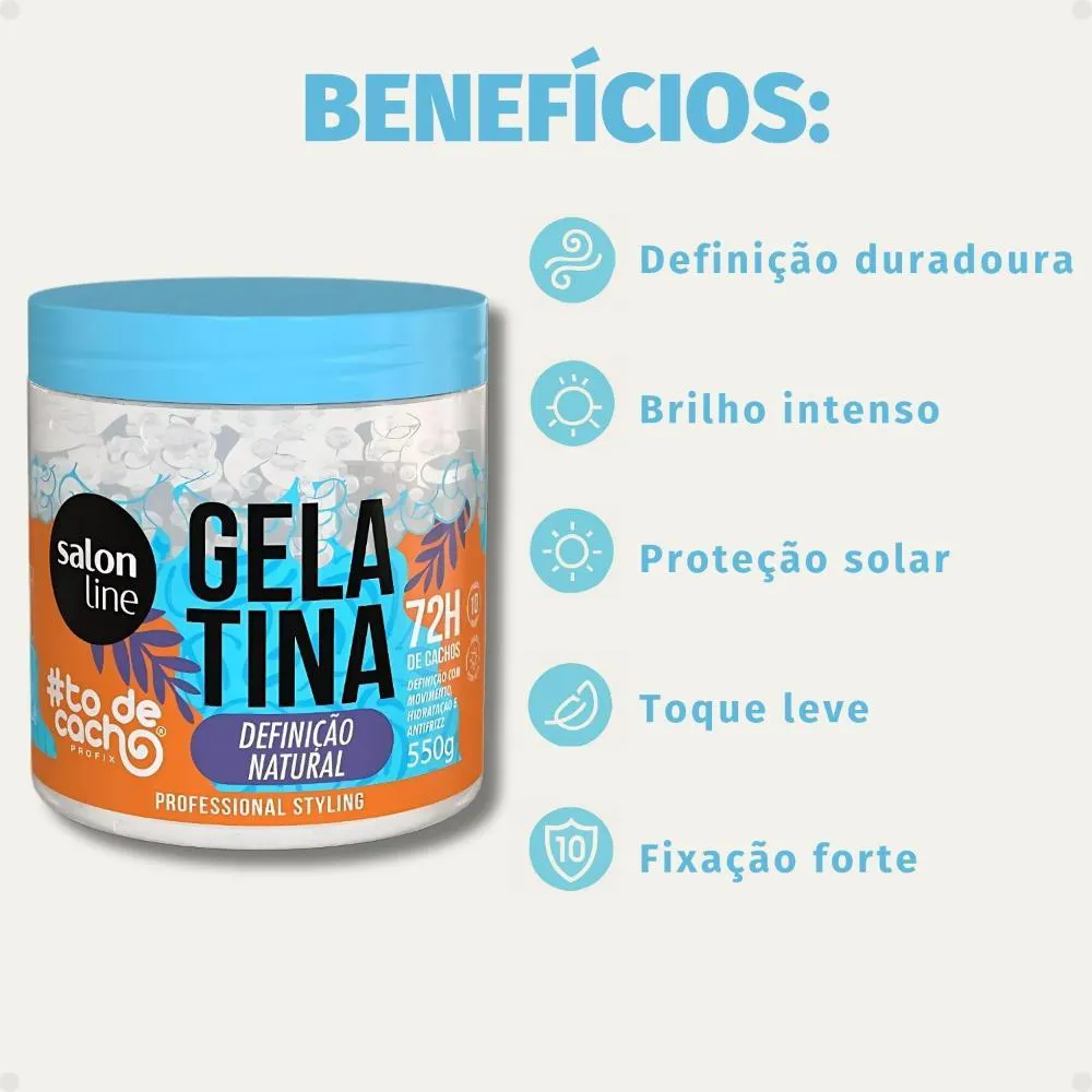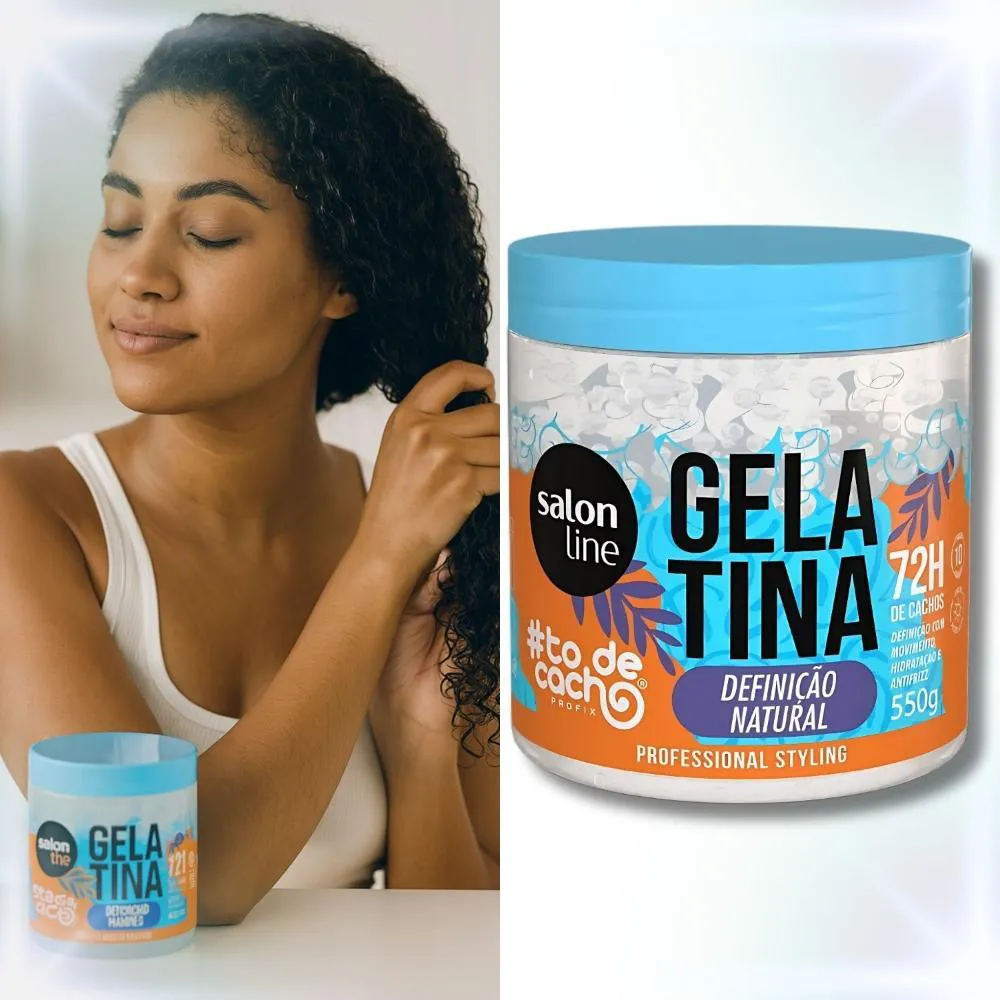 Descubra a Gelatina Salon Line Definição Natural #todecacho 550g, a aliada perfeita para quem busca cachos e ondas com definição flexível, movimento e brilho intenso. Desenvolvida pela SALON LINE, esta gelatina modeladora é ideal para controlar o frizz e proporcionar uma fixação duradoura, mantendo seus fios hidratados e com um toque leve.Com sua fórmula inovadora, a Gelatina #todecacho garante 72 horas de formatação e durabilidade impecáveis para cabelos ondulados, cacheados e crespos, realçando a beleza natural dos seus cachos.