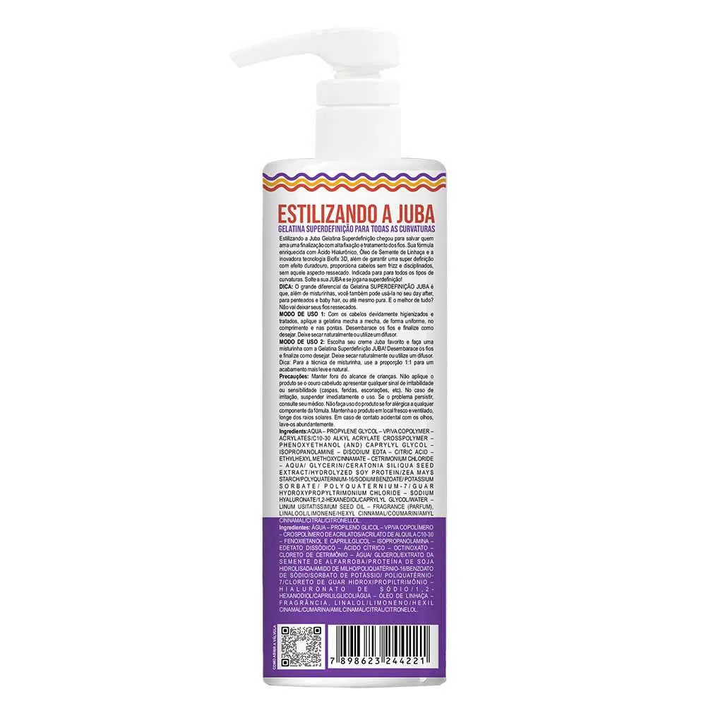 A Gelatina Super Definição é enriquecida com Ácido Hialurônico, que ajuda a manter a hidratação dos fios, Óleo de Semente de Linhaça, que proporciona nutrição e brilho, e a Tecnologia Biofix 3D, responsável por garantir uma fixação e definição superiores.