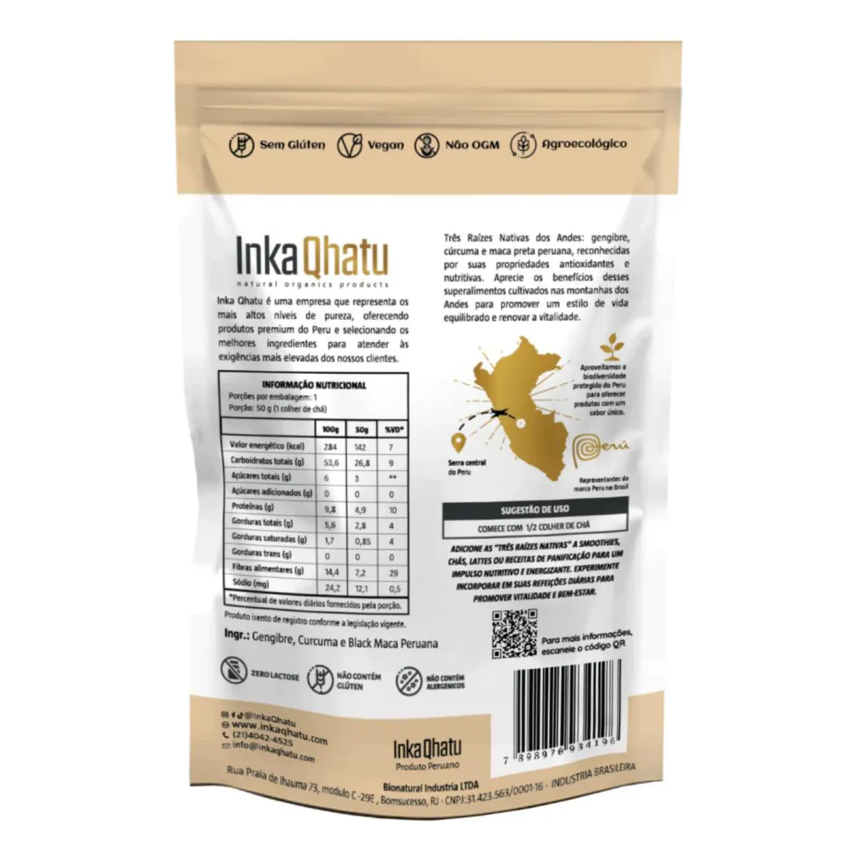 O Gengibre com Cúrcuma e Maca Peruana Preta Inka Qhatu é um produto em pó destinado ao preparo de bebidas e receitas. A combinação de ingredientes naturais oferece praticidade e versatilidade no consumo diário. Embalagem com 100 g.