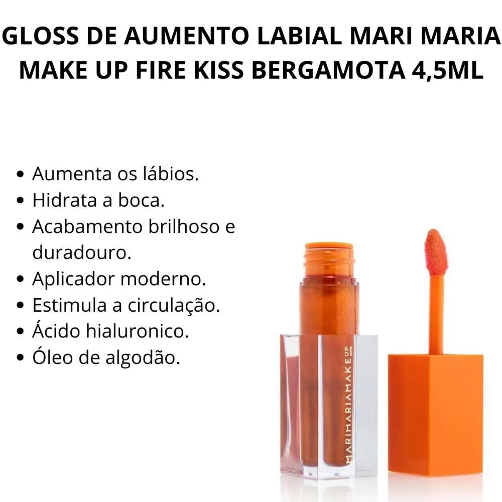 gloss de Aumento Labial Bergamota O Fire Kiss Mari Maria Makeup é um gloss para aumento dos lábios para resultado imediato e a longo prazo. Contém ácido hialurônico e óleo de algodão, potentes agentes hidratantes e ativo derivado da pimenta que estimula a circulação, promovendo aumento instantâneo nos lábios. . Benefícios -Aumenta os lábios. -Hidrata a boca. -Acabamento brilhoso duradouro. -Aplicador moderno. -Estimula a circulação. -Ácido hialurônico. -Óleo de algodão. . Modo de Uso Aplique diretamente nos lábios conforme desejado. Aguarde o efeito de aumento de volume. Pode ocorrer um leve formigamento por alguns minutos. Utilize o próprio aplicador ou pincel para lábios.