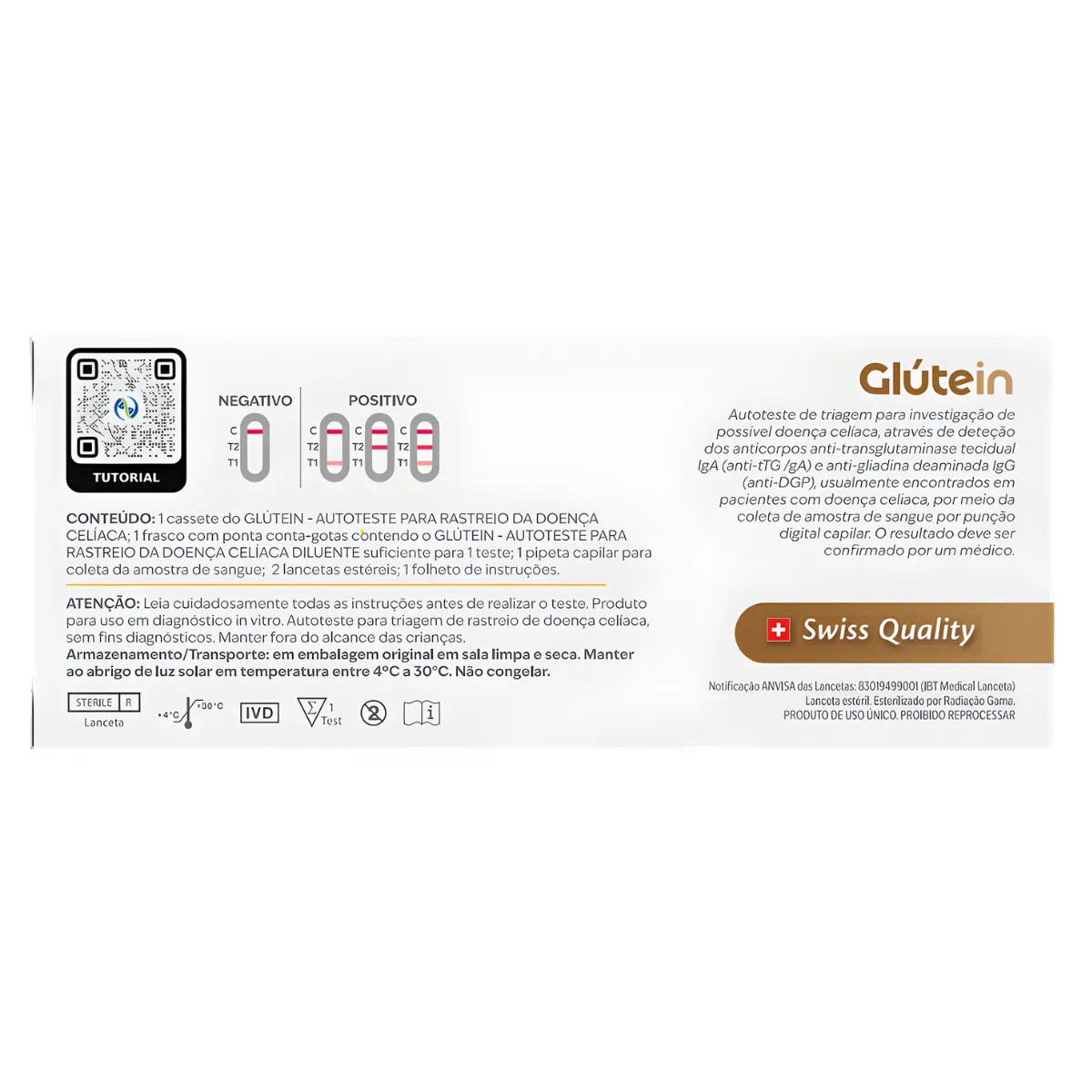 O Autoteste para Rastreio de Doença Celíaca Glutein é o primeiro e único autoteste de rastreio da doença celíaca que, assim como os testes laboratoriais, detecta os anticorpos Anti-Transglutaminase Tissular IgA (tTG IgA) e Anti-Gliadina Deaminada IgG (anti-DGP) em amostras de sangue obtidas por punção digital capilar. É clinicamente validado e oferece uma alternativa prática e confiável para o diagnóstico inicial da doença celíaca.