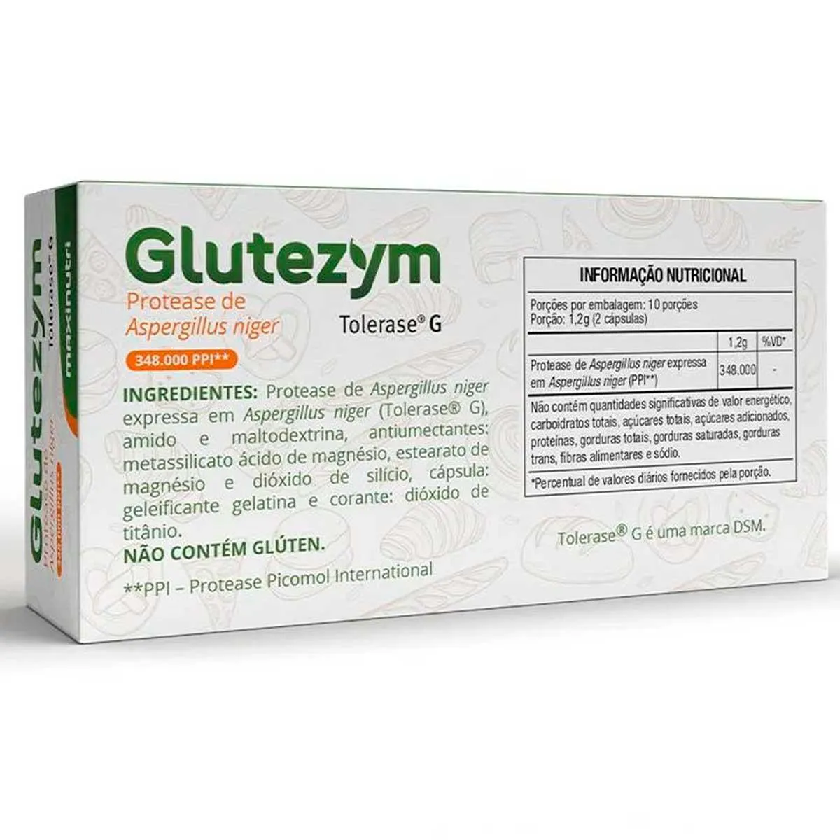 Protease de Aspergillus niger expressa em Aspergillus niger (Tolerase G), amido e maltodextrina, antiumectantes: metassilicato ácido de magnésio, estearato de magnésio e dióxido de silício, cápsula: geleificante gelatina e corante: dióxido de titânio.