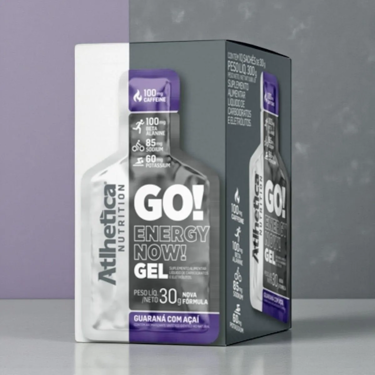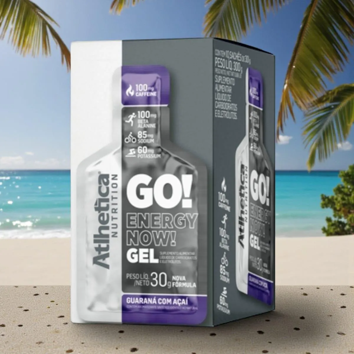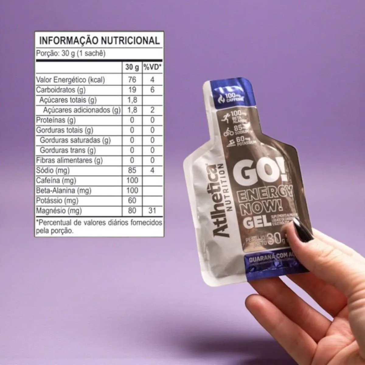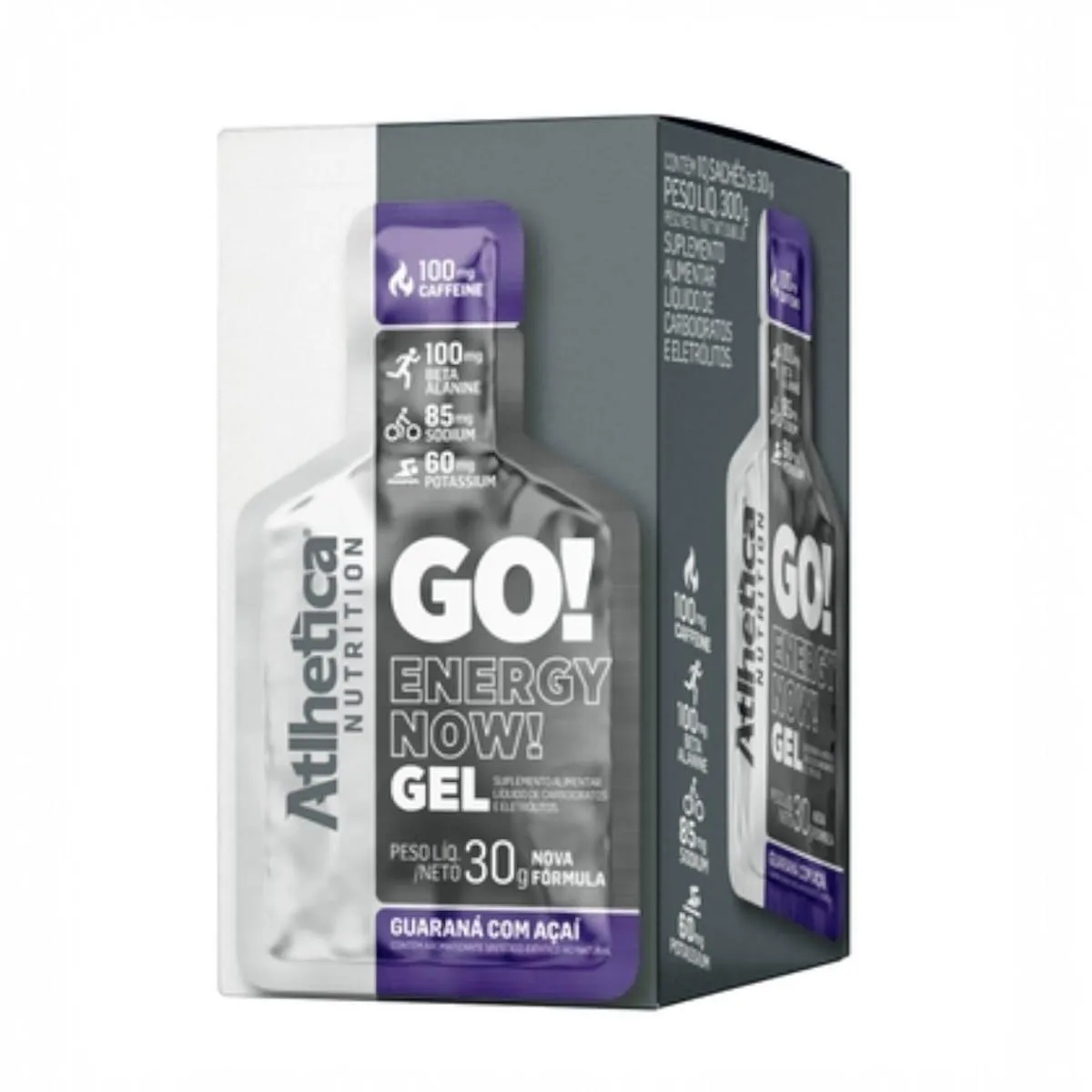 "GO! ENERGY NOW! GEL Mudar os hábitos e começar a praticar atividade física, qualquer que seja o seu objetivo, exige muita disciplina, energia mental e corporal. Nosso corpo é uma máquina com aprendizado rápido e dinâmico. Com rotinas cada vez mais estressantes e um dia a dia mais corrido, é comum que o cansaço seja predominante e você não tenha estímulos para a prática de exercícios físicos. A cafeína é um fitoquímico com ação estimulante, pode aumentar o estado de alerta, de concentração, além de ser uma substância natural que pode ser encontrada no café, guaraná, chá-verde e no cacau, por exemplo. Sua principal característica é a ação no sistema nervoso central, servindo como estimulante e contribuindo para o aumento do foco, raciocínio e desempenho esportivo, segundo pesquisas realizadas por cientistas em todo o mundo. Além de estimular a rotina de atividades físicas, recompor o organismo é uma das tarefas fundamentais e principais antes, durante e depois de qualquer exercício. Grande parte líquida do organismo é perdida no suor e, com ele, também se vai um importante nutriente: o sódio. Perder esse mineral em grandes quantidades pode significar desidratação, por isso é imprescindível o processo de recomposição. Inclusive, outro importante mineral essencial para quem pratica atividades físicas constantemente é o potássio. Participante do funcionamento das células, nervos e ossos, o potássio favorece o equilíbrio do pH no sangue, além de controlar a pressão arterial. Fundamental para os tecidos musculares, é peça importante na formação de suas fibras. Contém: 100mg Beta-Alanina, 60mg Potássio, 85mg Sódio, 100mg Cafeína. Não contém: Açúcares, Gordura Trans, Glúten. Modo de Usar: Consumir 30 g (1 sachê) com água, antes ou durante o exercício. Recomendado para indivíduos saudáveis a partir de 19 anos. Composição: [Maltodextrina, Palatinose (Isomaltulose), Cafeína, Beta-Alanina