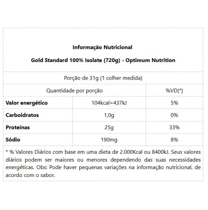 Para criar o 100% Whey Isolate Gold Standard a Optimum Nutrition selecionou apenas Whey Protein de alta qualidade que passa por uma série de sofisticados processos de filtração para isolar o excesso de gordura, colesterol e açúcar. Uma parte dessa proteína do soro do leite é hidrolisada, dividida em cadeias menores de aminoácidos (para facilitar a digestão). O produto final é uma proteína completa de digestão rápida que não contém mais do que 1 grama de carboidratos, 0,5 gramas de gordura e mais de 80% de proteína pura por dose. A Optimum trabalhou duro para garantir qualidade superior, para que você possa se concentrar em atingir metas e melhor desempenho em seus treinos. Ela além de testar cada ingrediente que chega à fábrica para verificar as especificações precisas, testaram cada produto em diferentes estágios de produção. Este é a garantia de qualidade que a ON tem com seus consumidores. Benefícios:- Proteína Isolada pura de qualidade;
