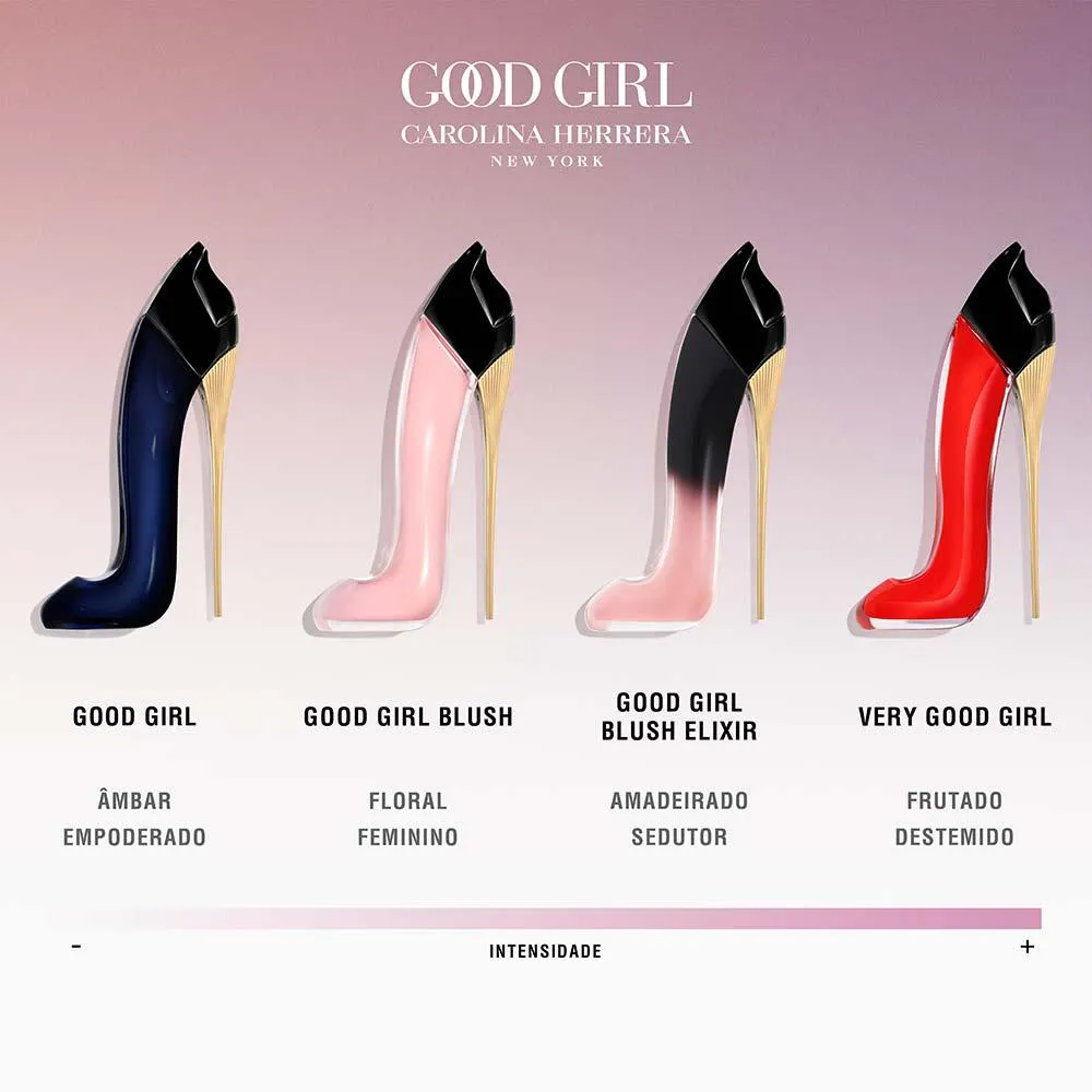 Nunca subestime o poder do salto. Good Girl tem um frasco com design único no formato de um salto agulha. A beleza da alta costura mesclada com um savoir faire altamente inovador que só House Of Herrera poderia alcançar. Com os sapatos certos, uma mulher pode conquistar o mundo. Essa foi a inspiração de Carolina Herrera para Good Girl.