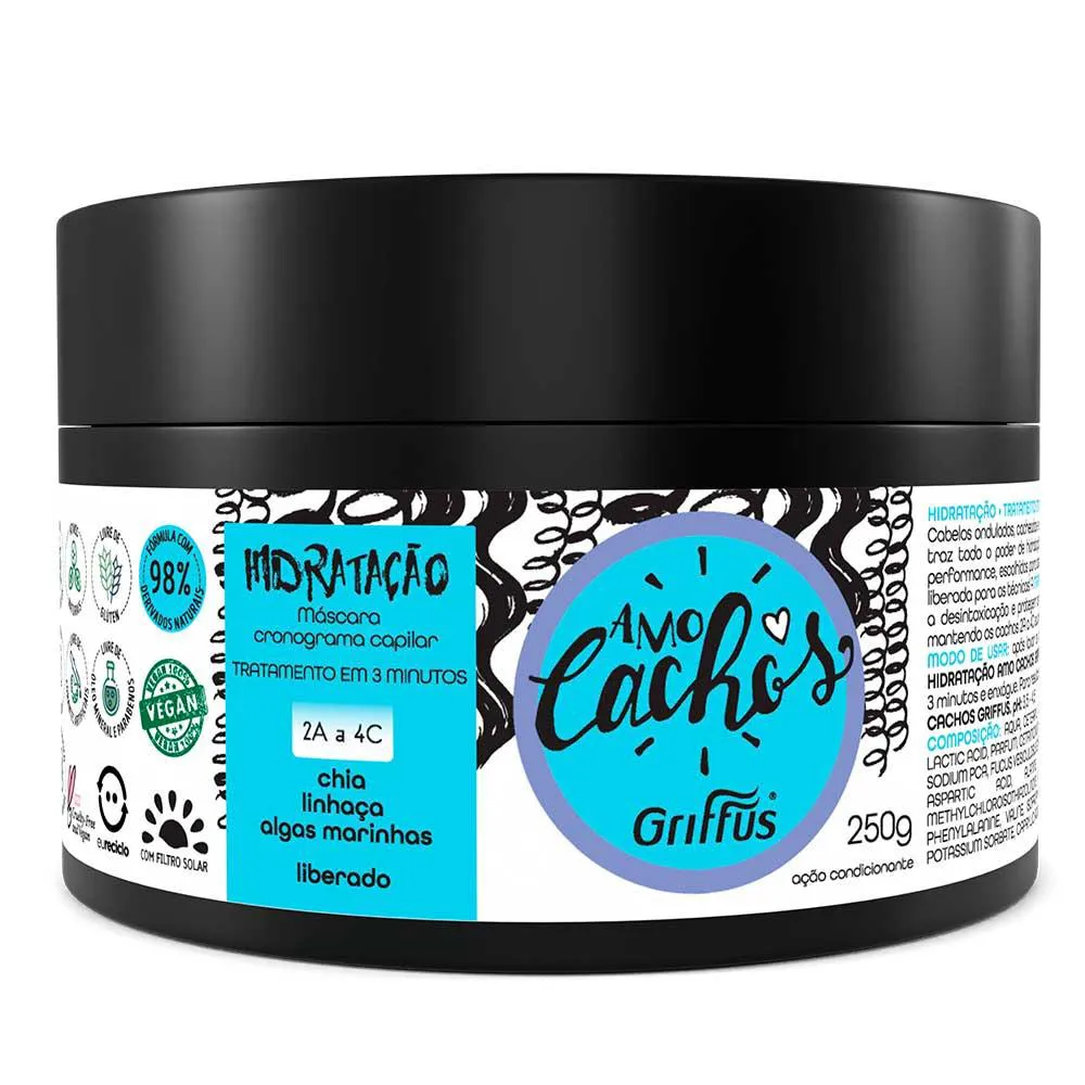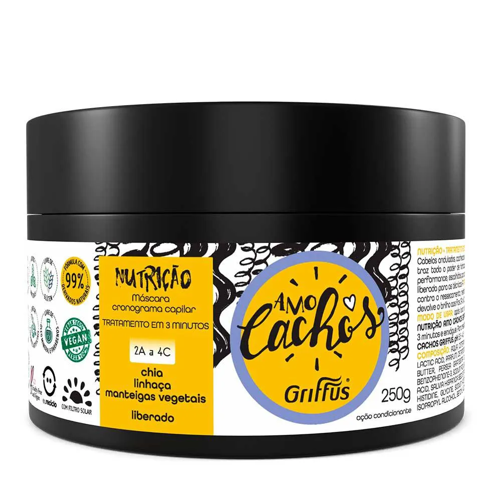 A Máscara Amo Cachos, da Griffus, foi feita para atender as necessidades das cacheadas de qualquer tipo de curvatura. Seus ativos hidratam intensamente e permitem com que os fios mantenham sua saúde e beleza por mais tempo. Possui fórmula condicionadora e com filtro solar.