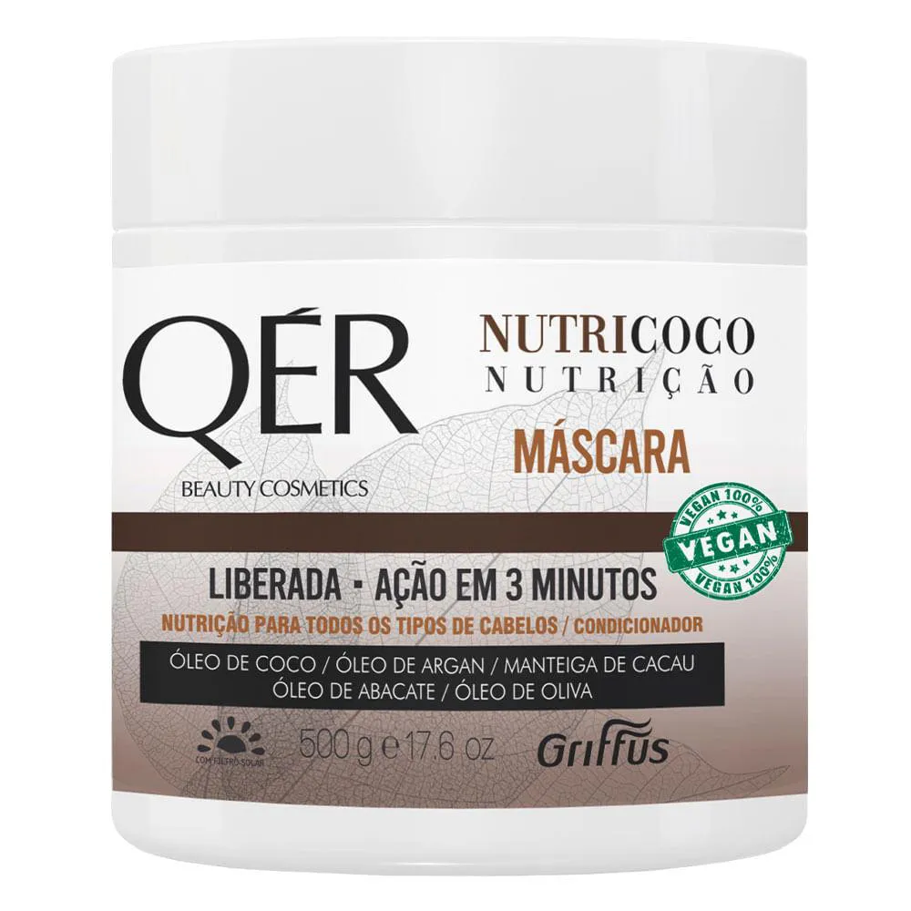A Máscara QÉR Beauty Cosmectis Nutricoco Griffus recupera a fibra capilar, além de promover brilho, maciez e nutrição ao cabelo. Com ativos que fazem a diferença, o óleo de coco repara a fibra capilar, o óleo de abacate recupera a maleabilidade, o óleo de argan restaura os fios, a manteiga de cacau revitaliza e promove hidratação, enquanto o óleo de oliva possui propriedades hidratantes que resultam em brilho e maciez. Liberado para as técnicas, com ativos naturais e tecnológicos, livre de parabenos, corantes artificiais, óleo mineral e silicone.