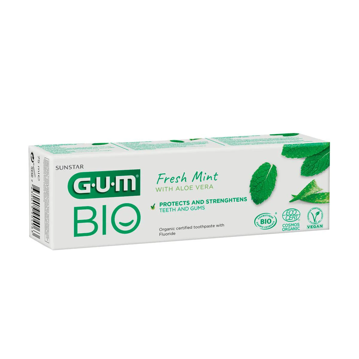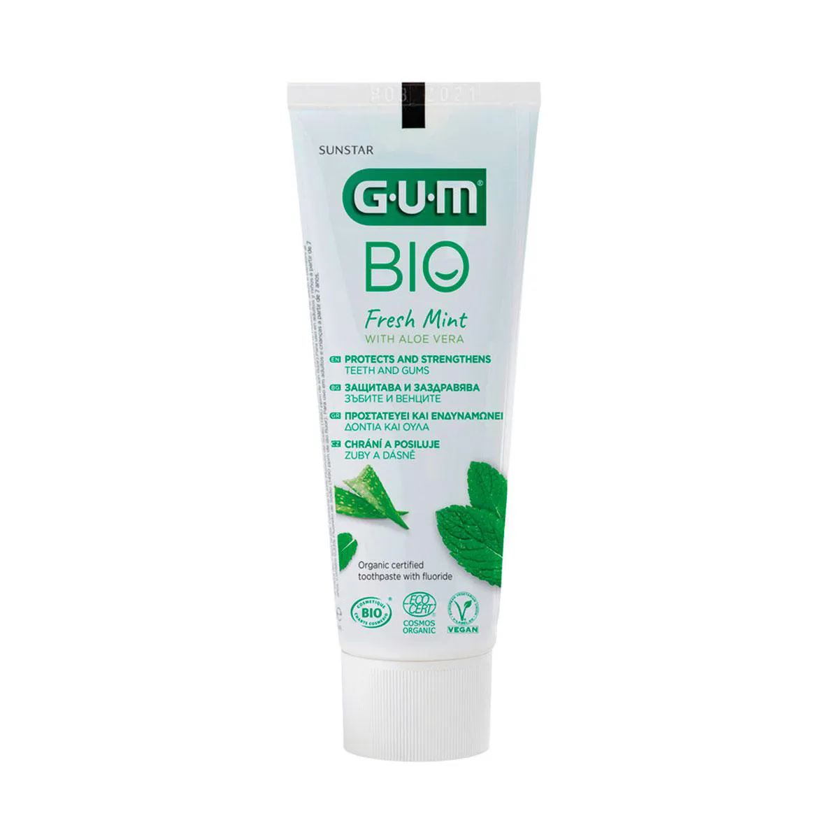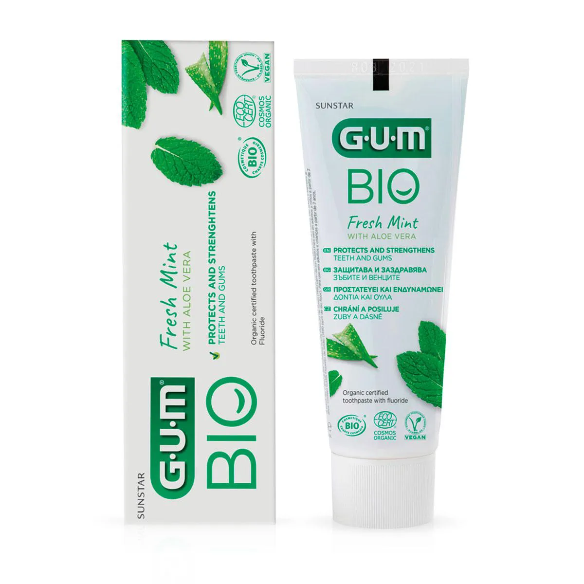 - Creme dental GUM Bio com 99% de ingredientes de origem natural para cuidado bucal.